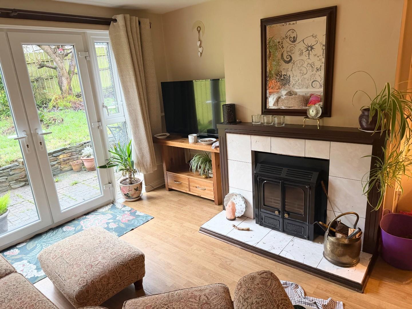 Laminate flooring, solid fuel stove set in a tiled fire place with matching hearth, double doors to Patio and garden.