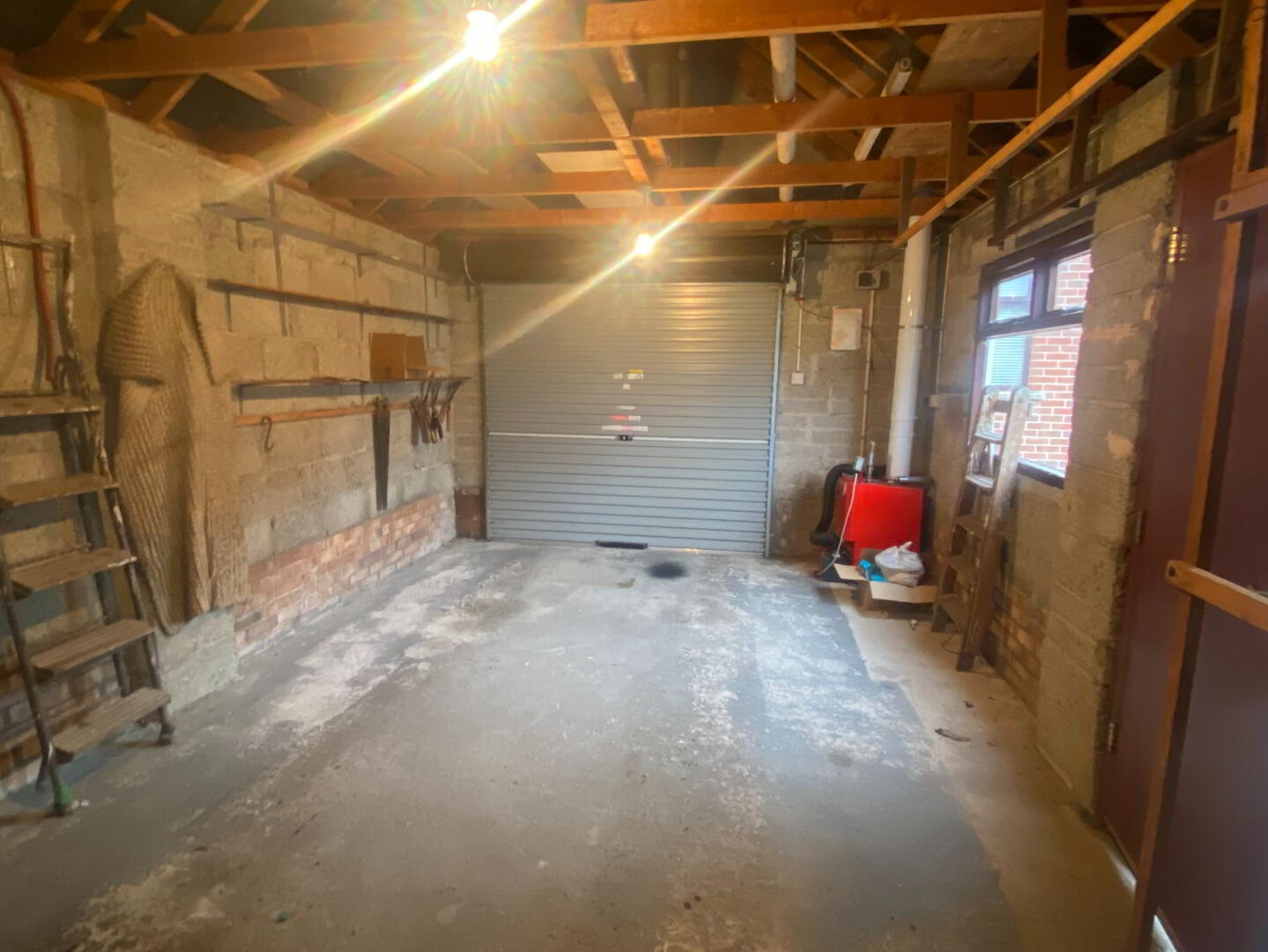5.28m x 3.67m (17' 4" x 12' 0") Roller shutter door, wood panel, side door, light & power, boiler housing.
