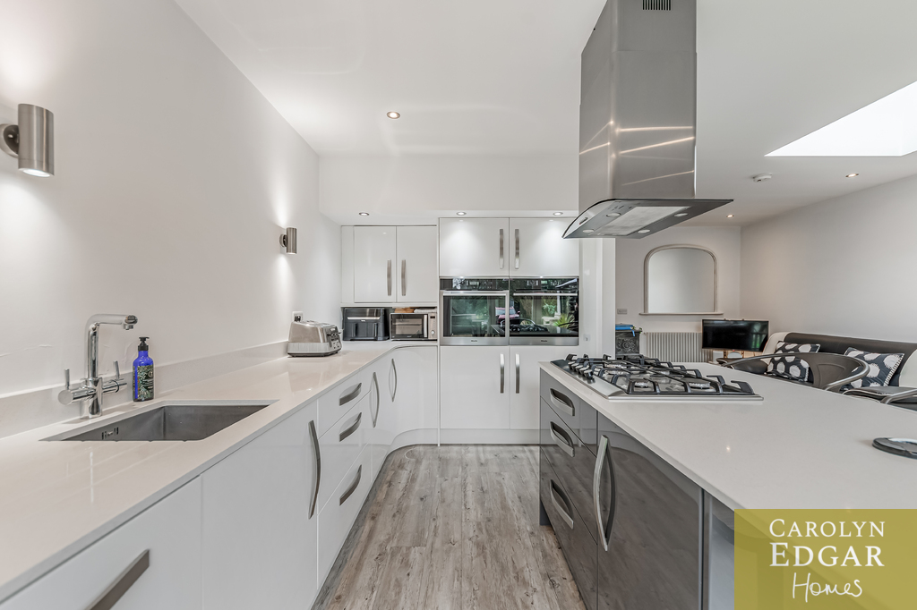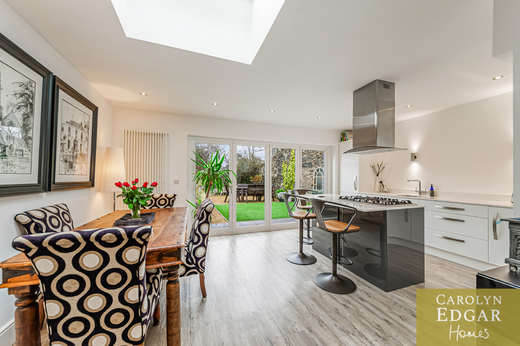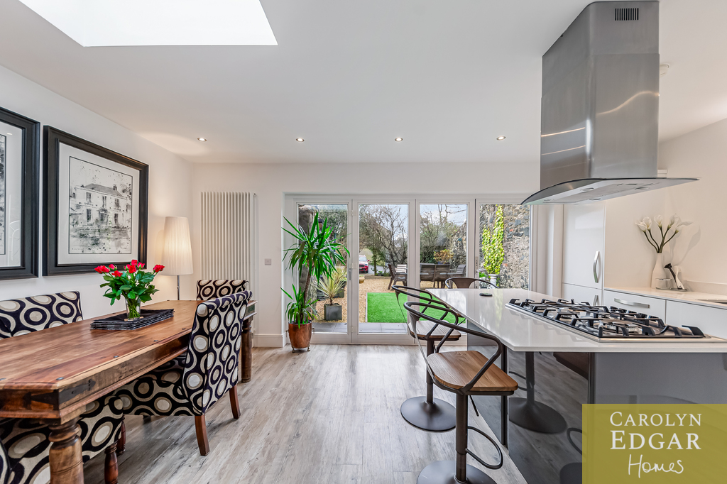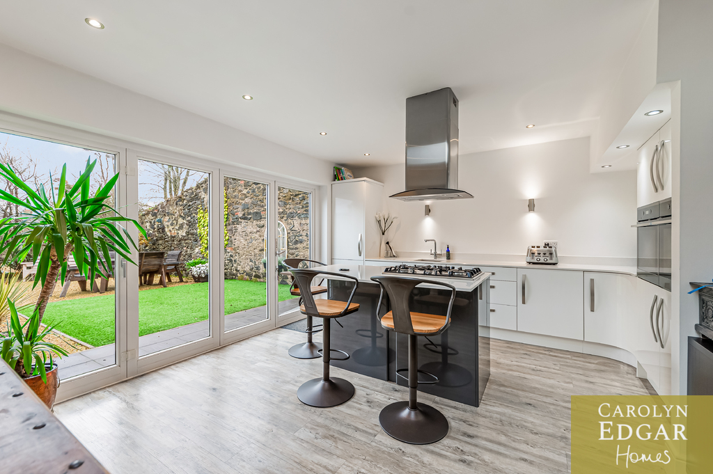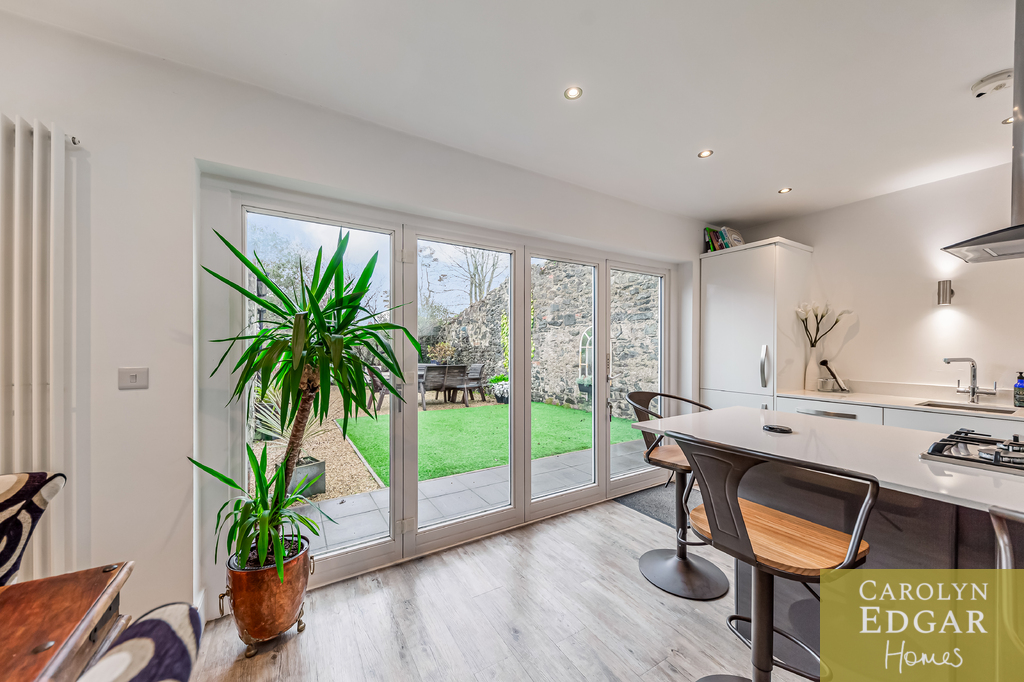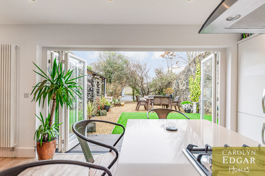 Contemporary Open Plan Kitchen with Vaulted Ceilings and Bio Fold Doors Overlooking Walled Gardens and Sun Terrace
