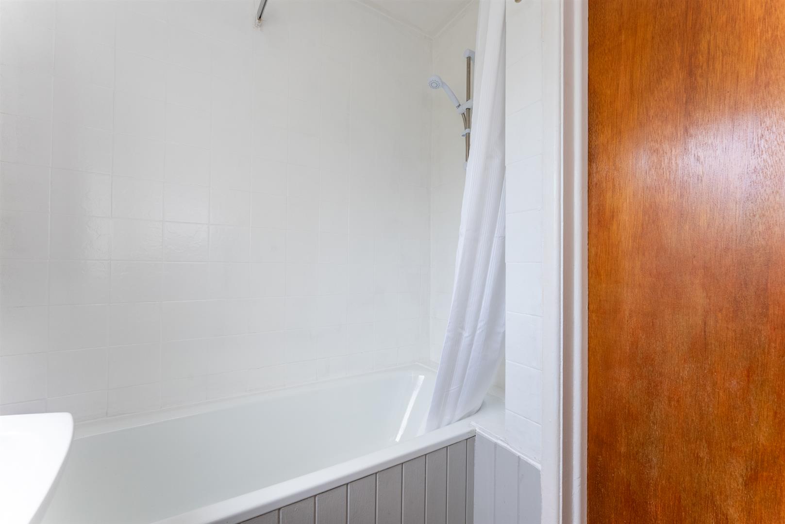 White suite comprising low flush w.c, wash hand basin and bath with overhead shower.