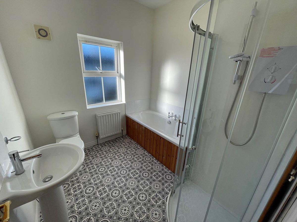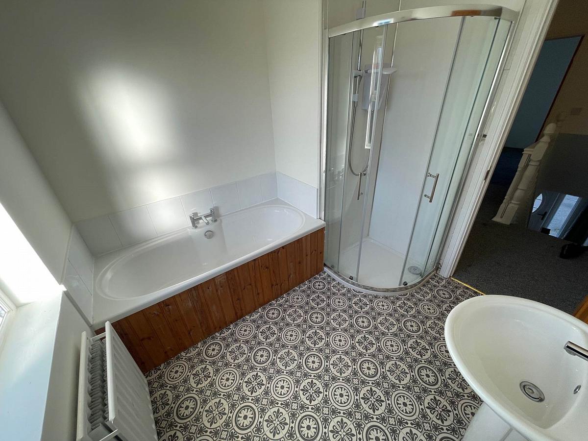 Family bathroom with white bath suite and separate shower cubicle with electric shower.