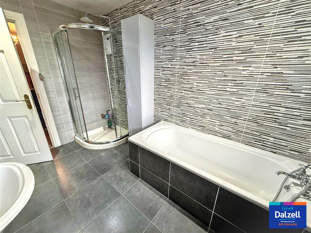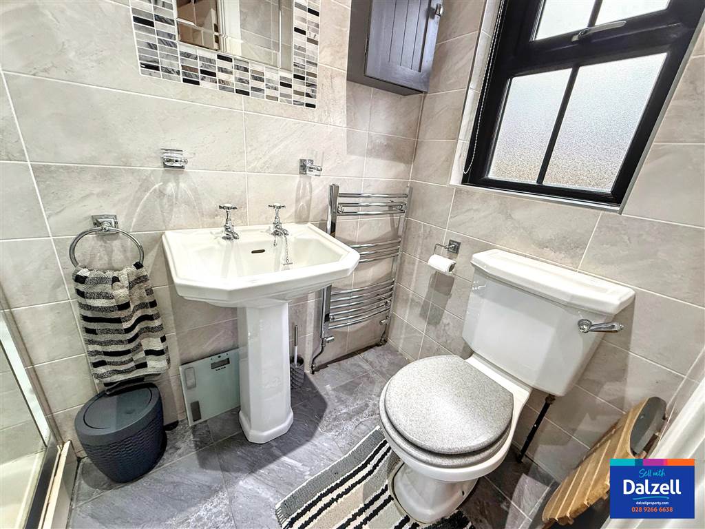 Fully tiled shower with 'Aqualisa' power shower fittings, pedestal wash hand basin, WC. Fully tiled walls and floor. Chrome towel radiator. PVC panelled ceiling with recessed spotlights and extractor.
