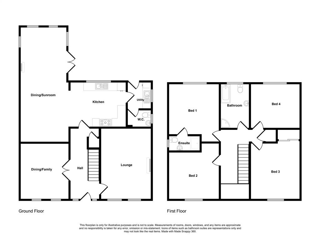 Ground Floor - Hall, lounge, dining/family room, kitchen open plan to dining and sun room, utility room and WC.