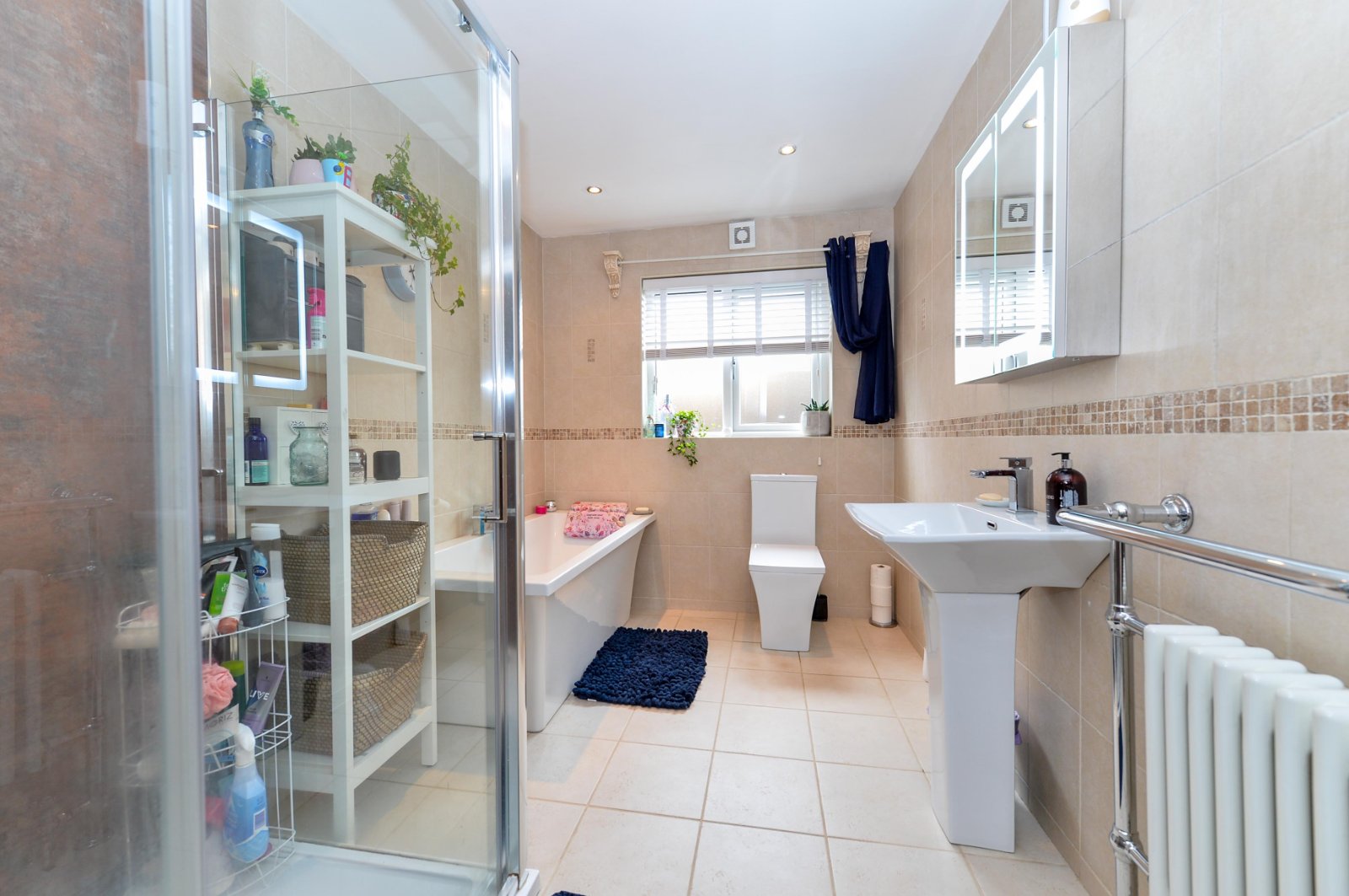 White suite, panelled bath with chrome mixer taps, dual flush close coupled WC, pedestal wash hand basin with chrome mixer taps, double built shower cubicle with thermostatically controlled shower and overhead rainforest drencher, ceramic tiled floor, fully tiled walls, recessed spotlights.