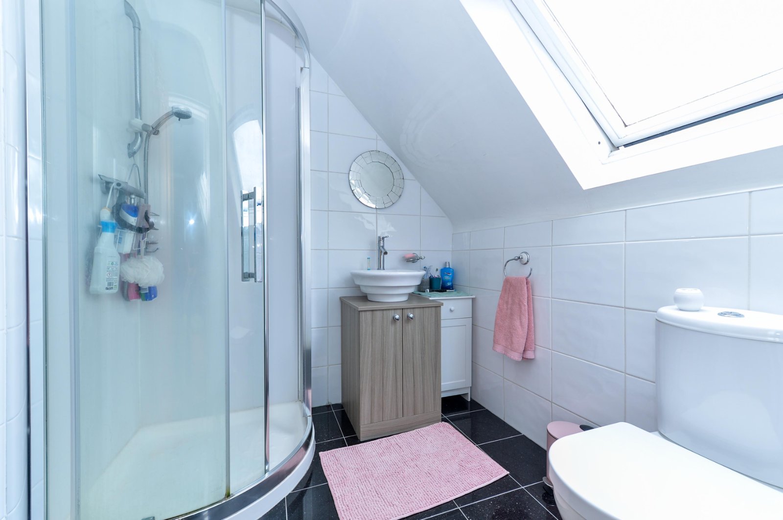 White suite, built in shower cubicle with thermostatically controlled shower, vanity unit with mixer taps, ceramic tiled floor, chrome heated towel rail, dual flush close coupled WC, half tiled walls, recessed spotlights.