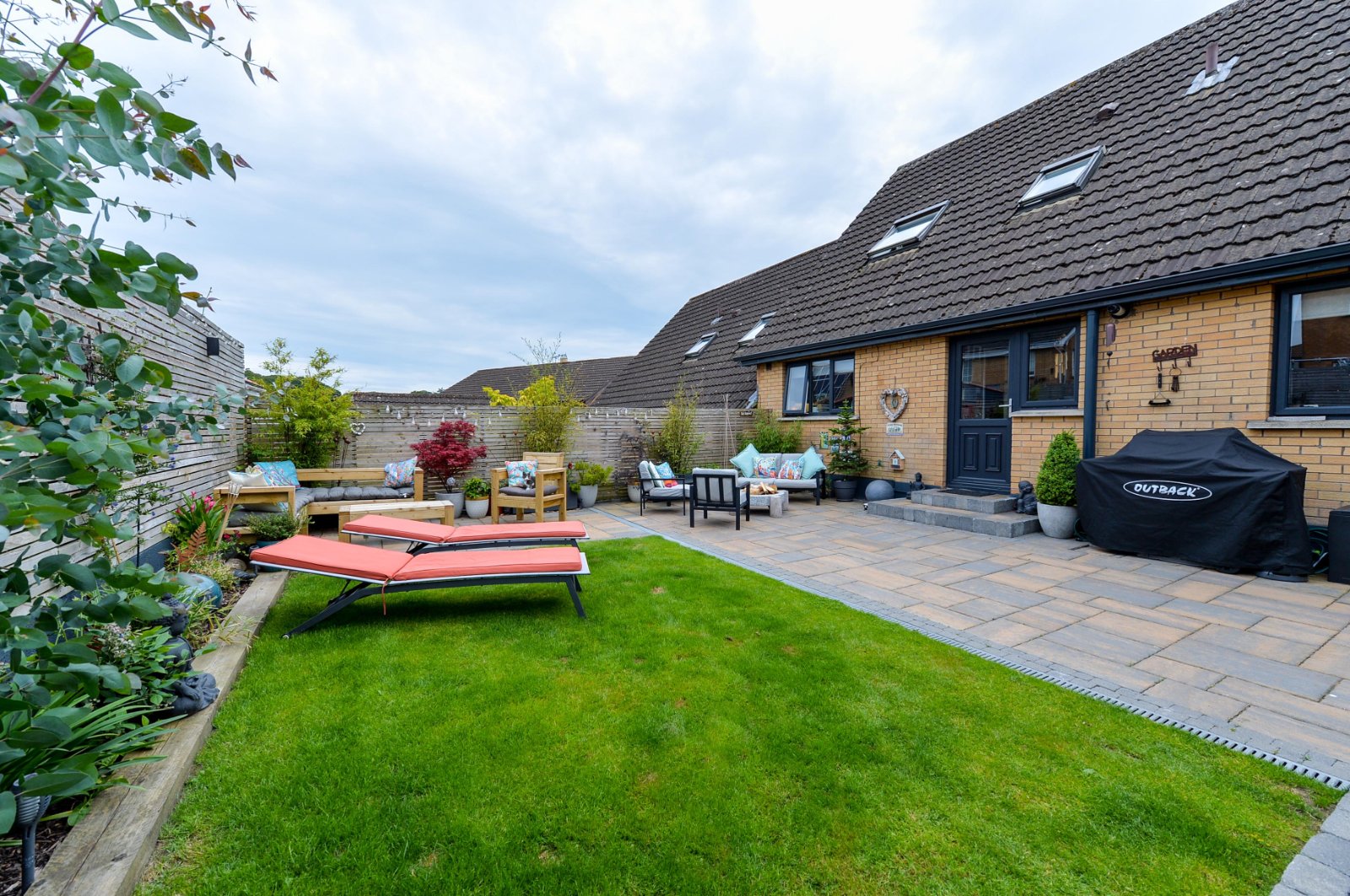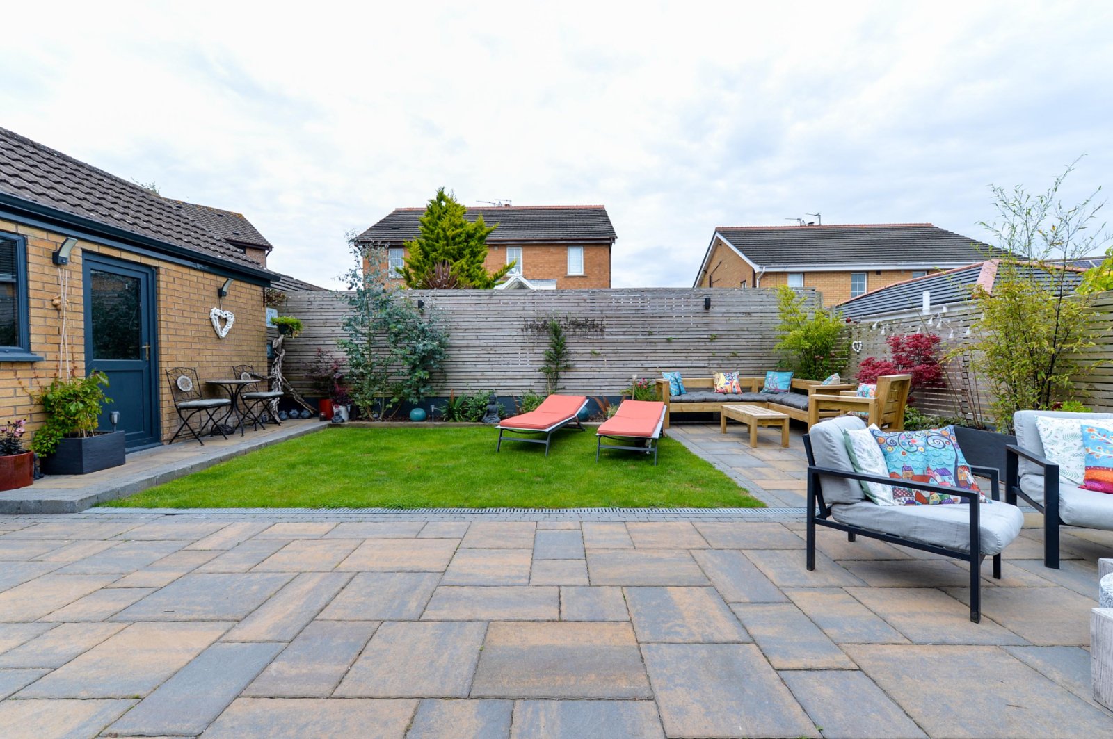 Enclosed garden to rear in lawns, shrubs, flowerbeds, extensive paved patio area, outside light and tap, boundary fencing.