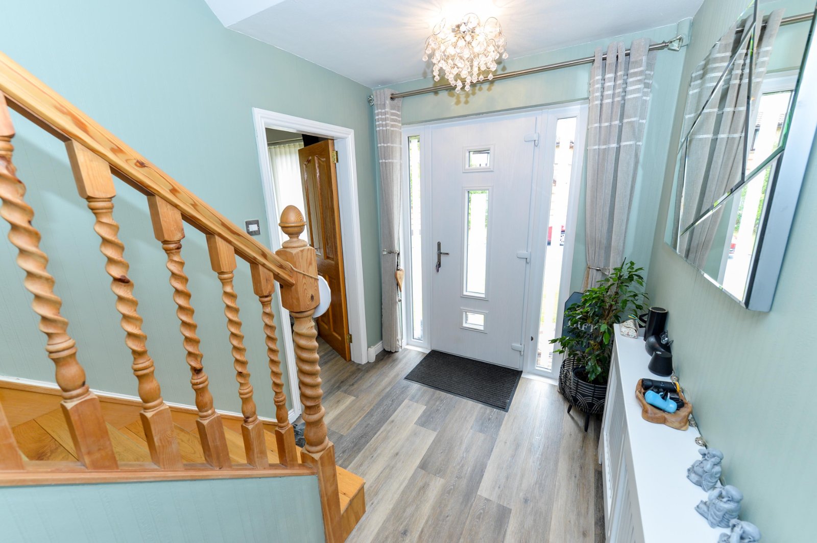 Composite front door with double glazed side panels, reception hall, under stairs storage.