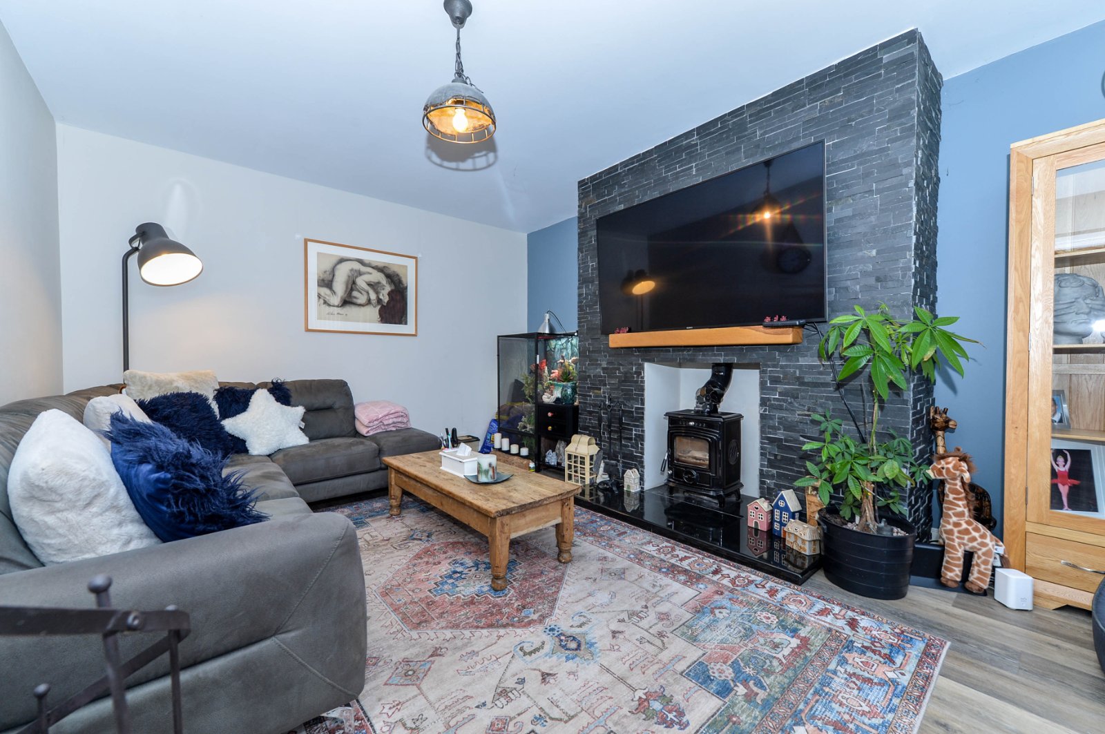 Wood burning stove, marble hearth, tiled chimney breast, laminate wooden floor.
