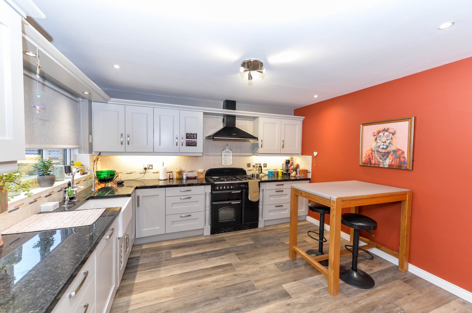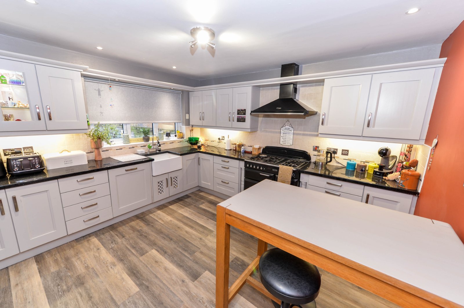 Belfast sink unit with chrome mixer taps, excellent range of high and low level units with Granite work surfaces, tiled splash back, glazed display cabinets, pelmet lighting, recessed low voltage spotlights, chimney extractor, integrated dishwasher, ample dining and breakfast area.