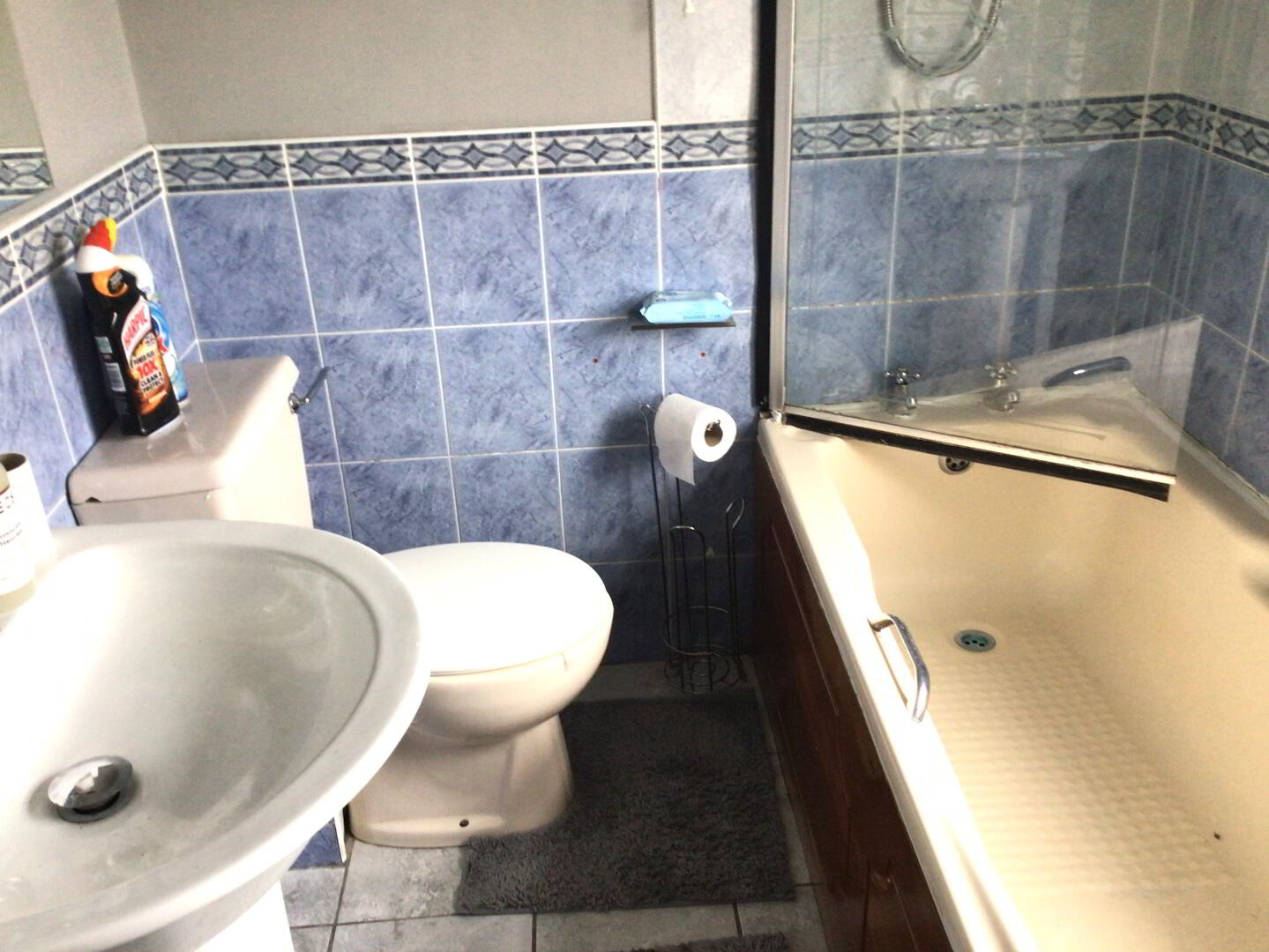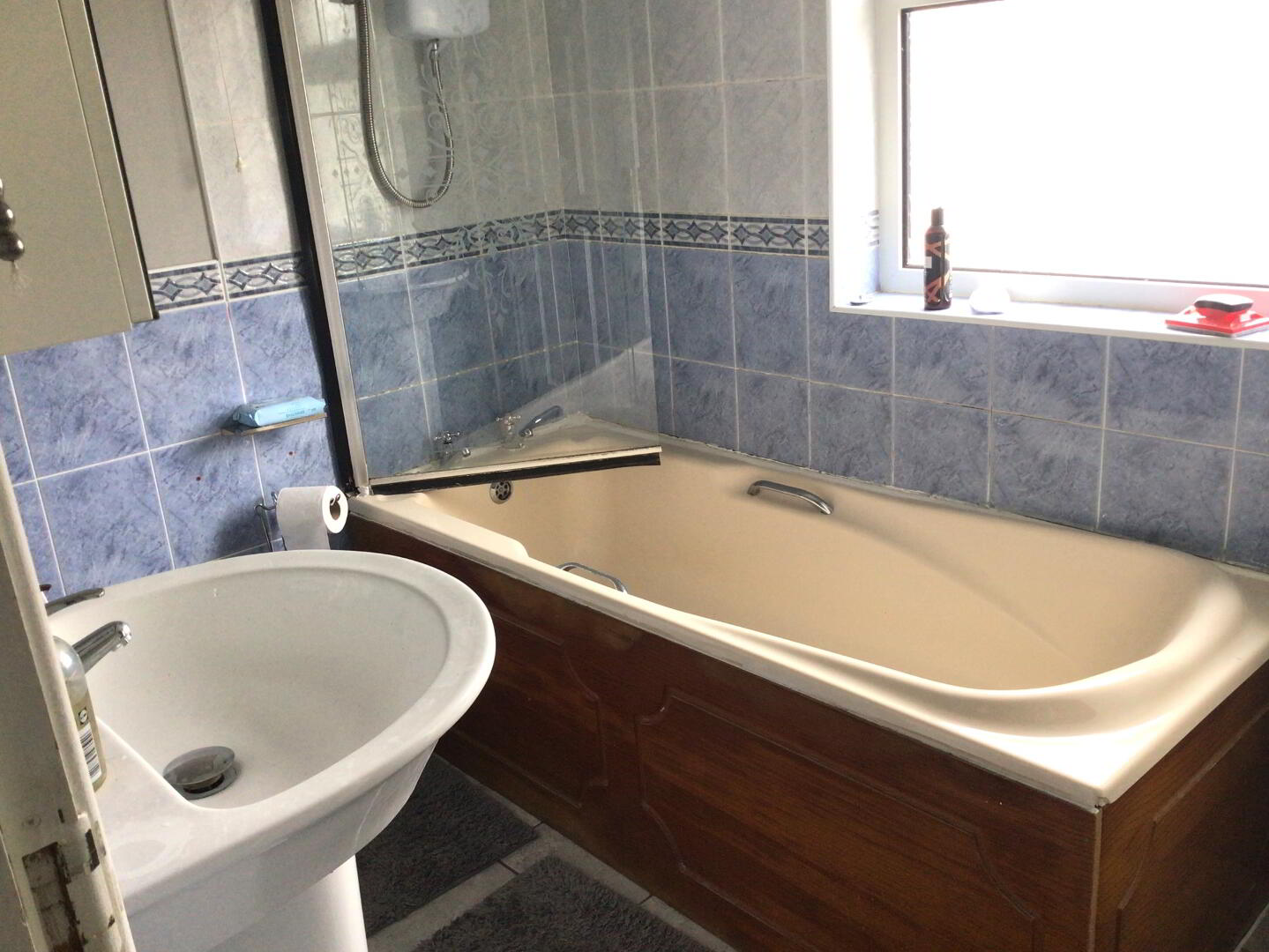 White Suite comprising, Close Coupled WC, Panelled Bath with Mira Electric Shower, and Pedestal Wash Hand Basin with vanity unit. Part Tiling to walls. . Single Panel Radiator.