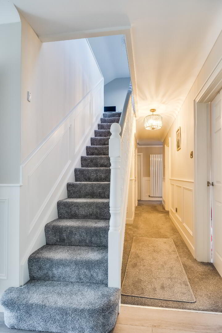 Moulded wall panelling, hotpress, wall mounted tall radiator, staircase
