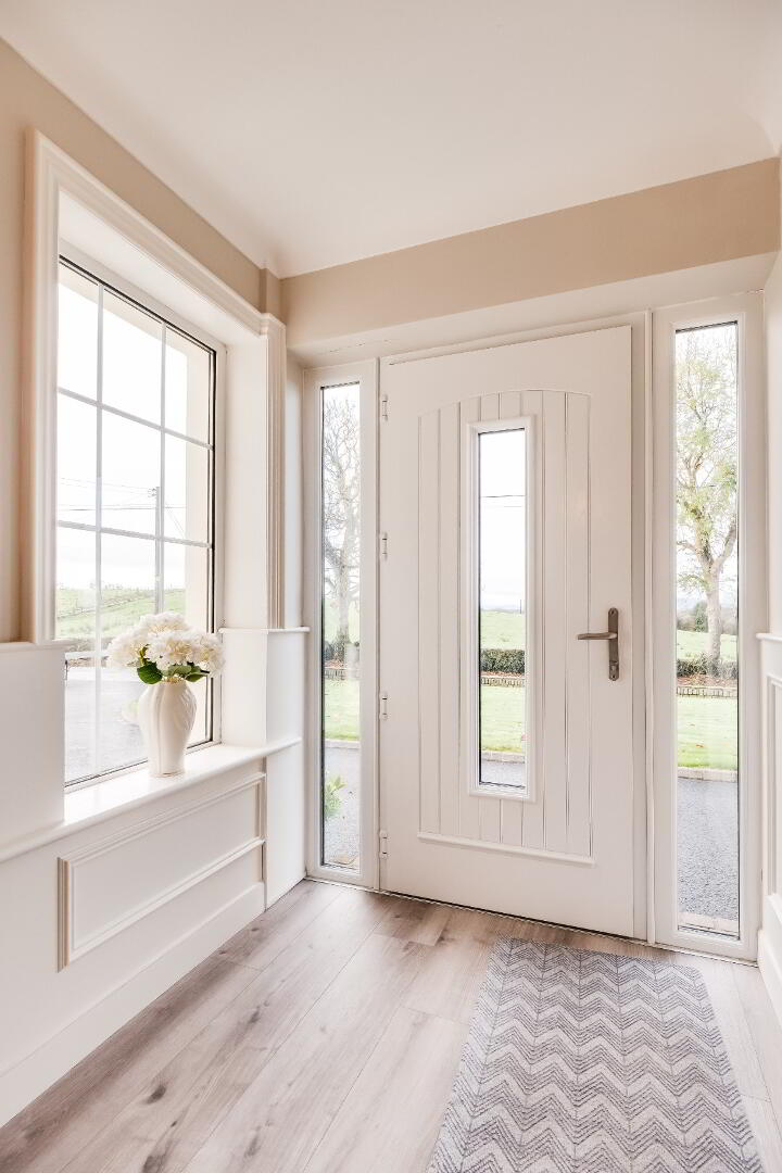 PVC exterior door with glazed inset & side screens, laminate flooring, moulded wood panelling, ceiling cornice, wall mounted tall radiator.