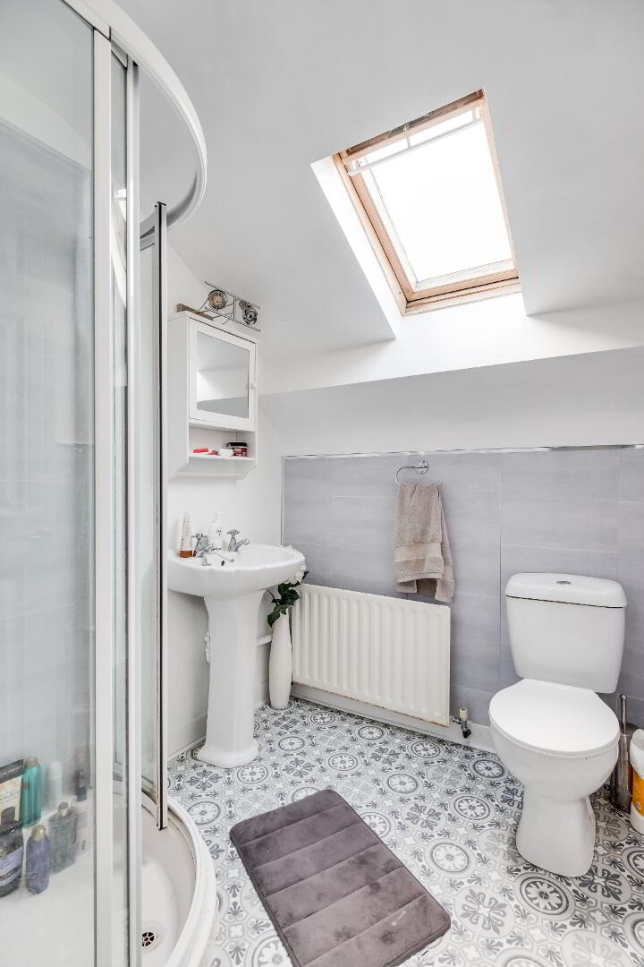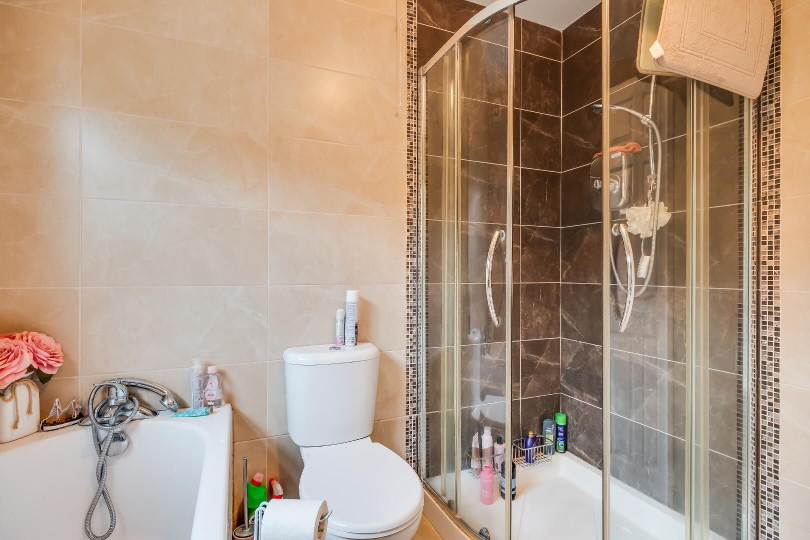 White suite, step in shower cubicle with electric shower, fully tiled, heated towel rail.