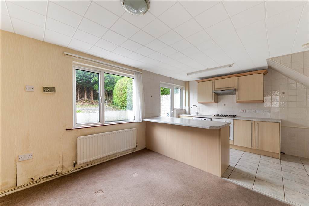 Range of high and low level units, Formica work surfaces, stainless steel sink unit with mixer taps, 4 ring gas hob and electric oven, extractor fan, plumbed for washing machine, fridge freezer space, open to dining, partly tiled walls, ceramic tile flooring.