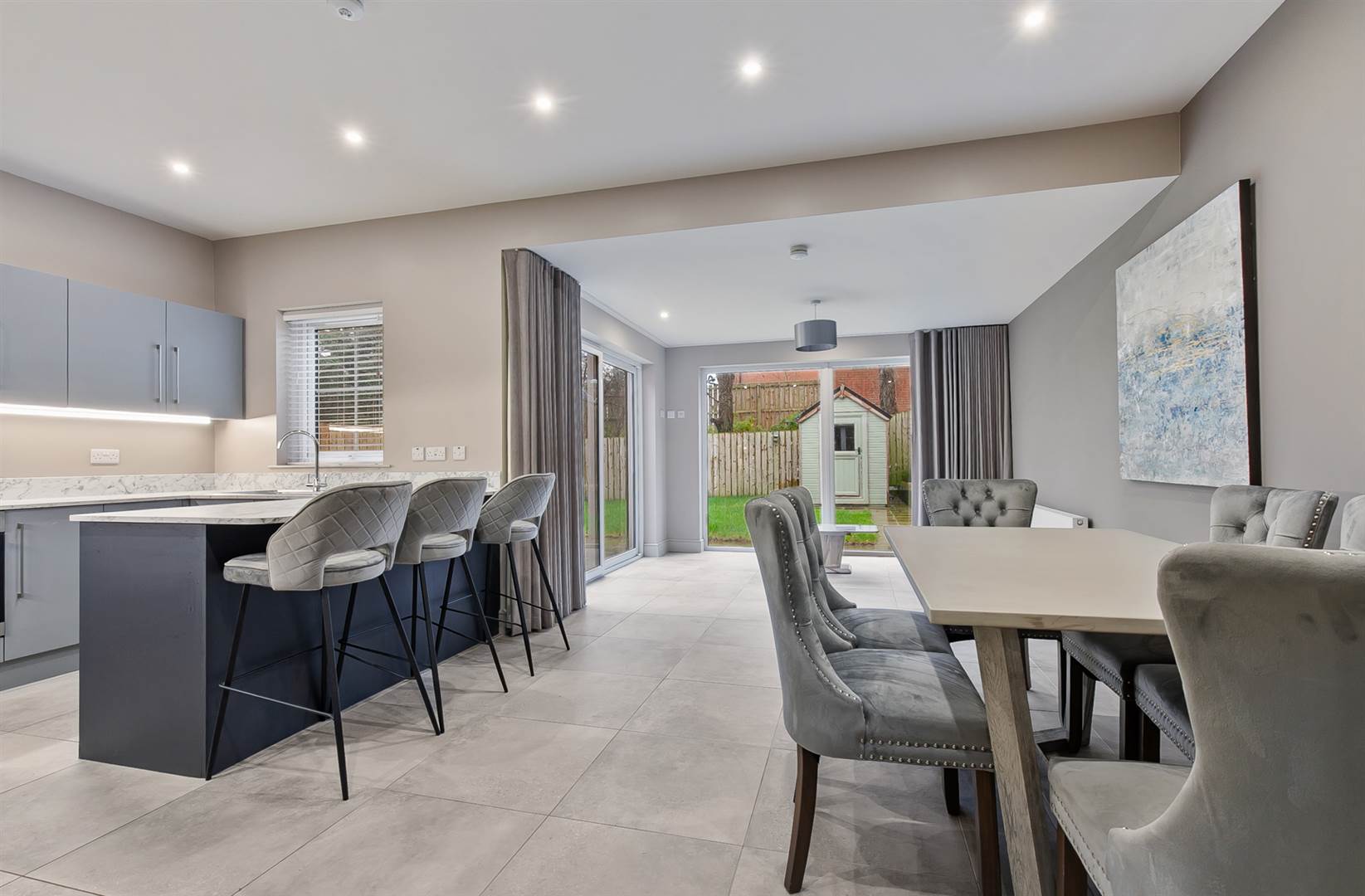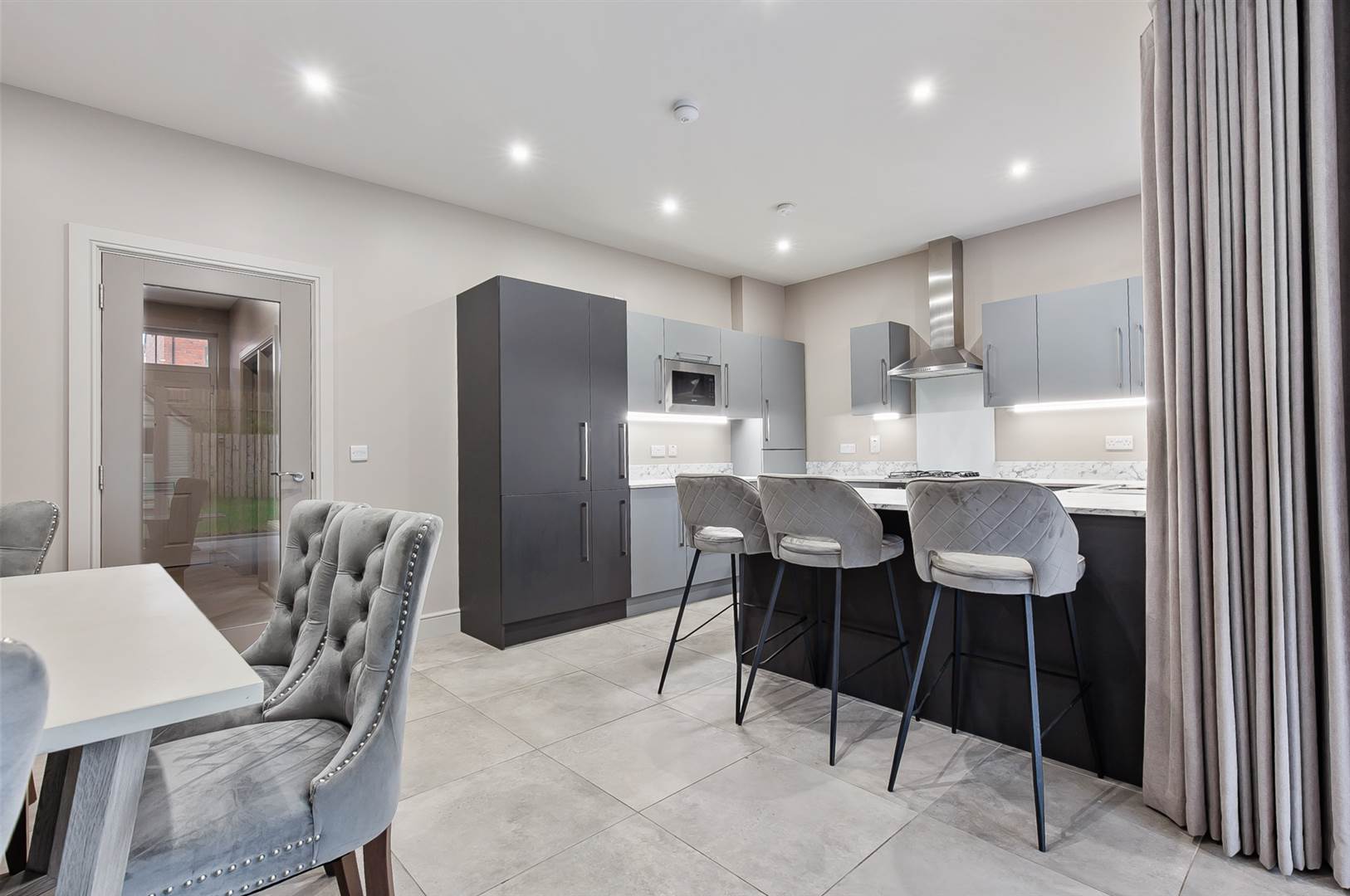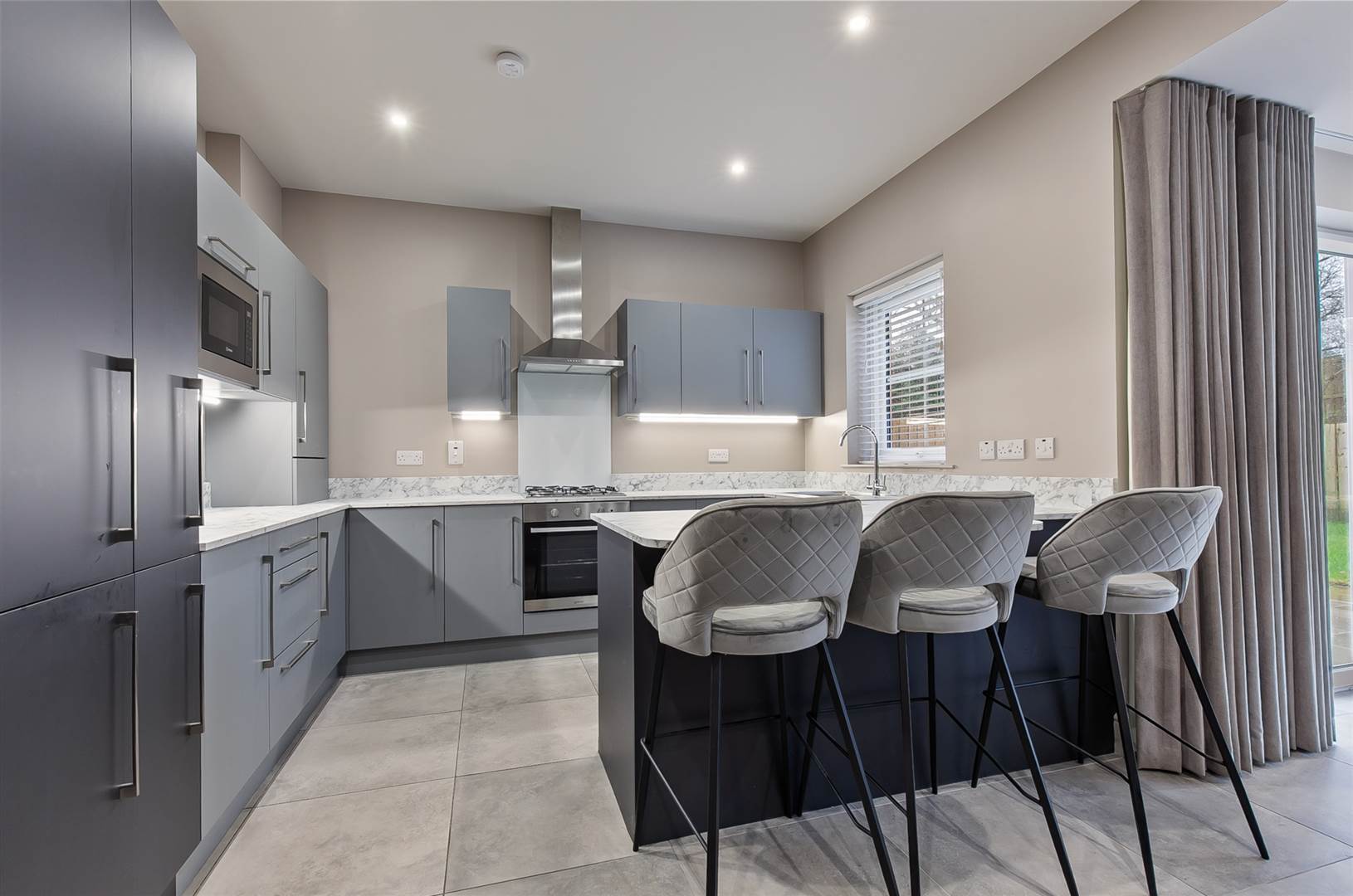 Extensive range of high and low level modern cupboards, stone effect worktops, inset stainless steel sink unit with mixer tap, breakfast bar area, four ring gas hob, under oven, stainless steel extractor, integrated dishwasher, micro oven and washing machine, larder fridge freezer, concealed boiler, under unit lighting, ceramic tiled floor, low voltage lighting.