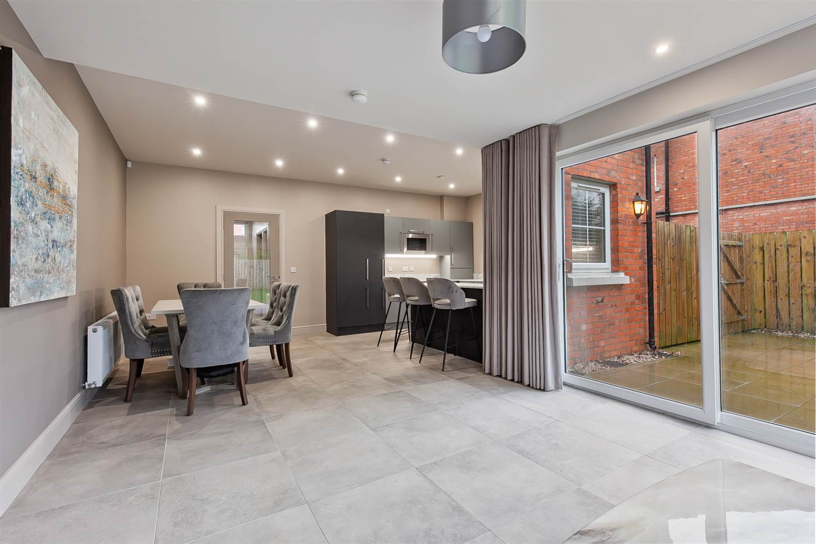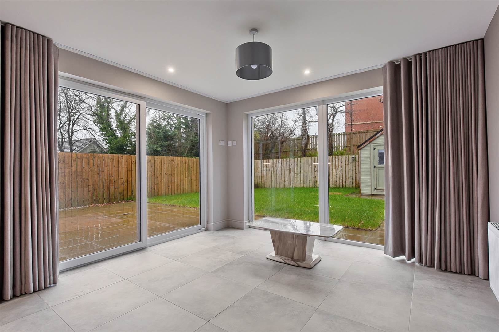 Benefits from large PVC windows overlooking the garden, double glazed sliding door. Low voltage lighting.
