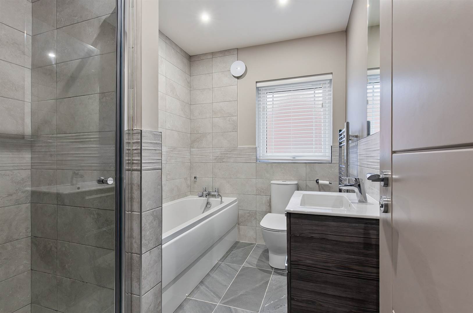 Luxury suite comprising panelled bath with mixer tap and telephone shower, low flush wc, wall mounted sink unit and mixer tap with cupboard below, fully tiled shower cubicle with thermostatically controlled shower and over drencher, ceramic tiled floor, part tiled walls, heated towel radiator.