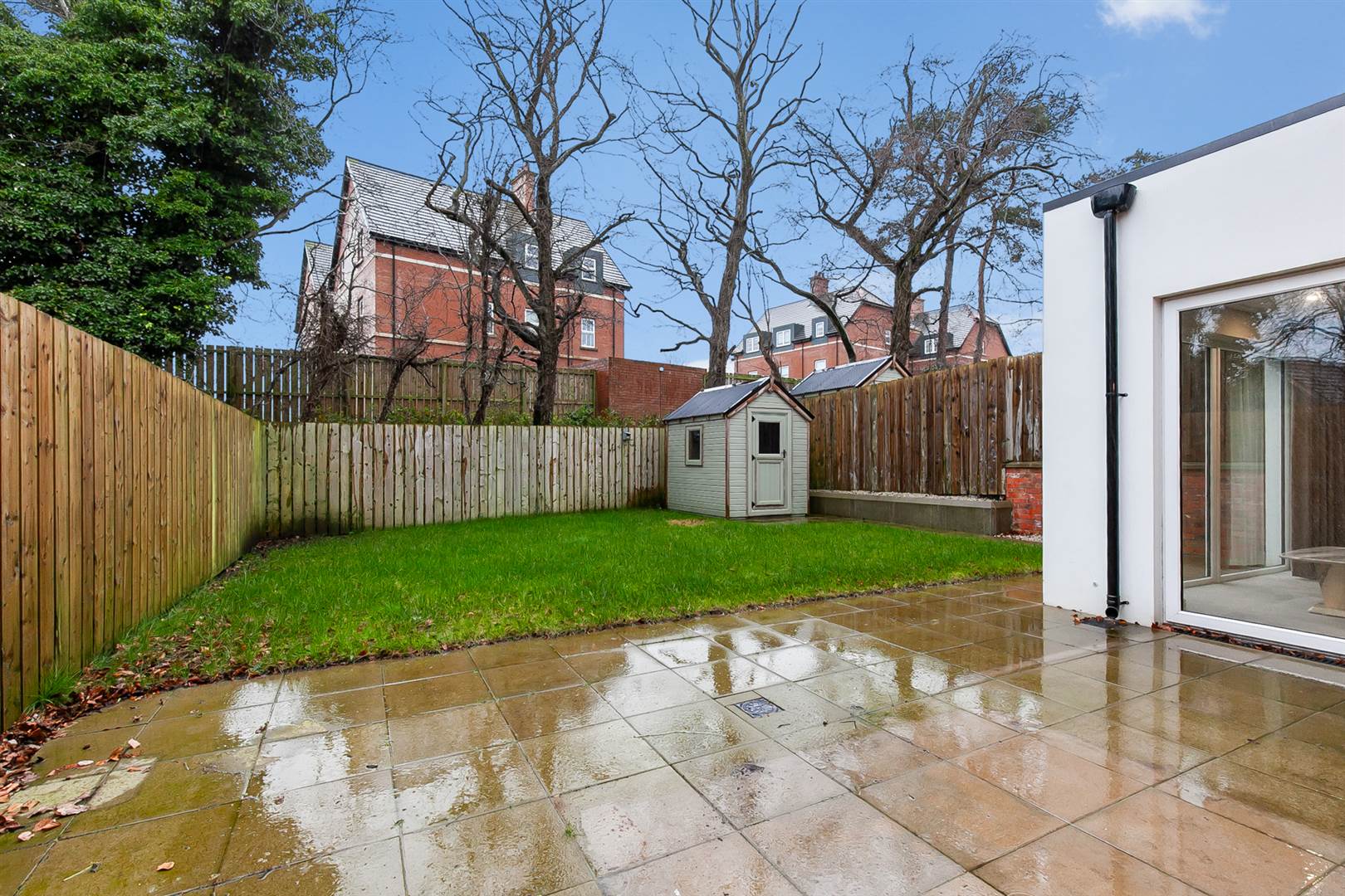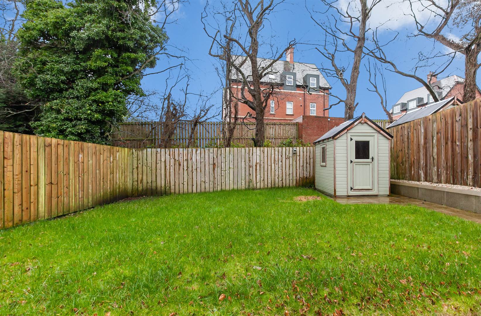 Fully enclosed rear garden, laid in lawns and patio area, purpose built garden store