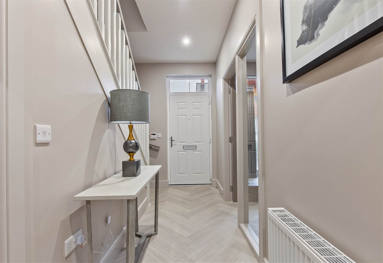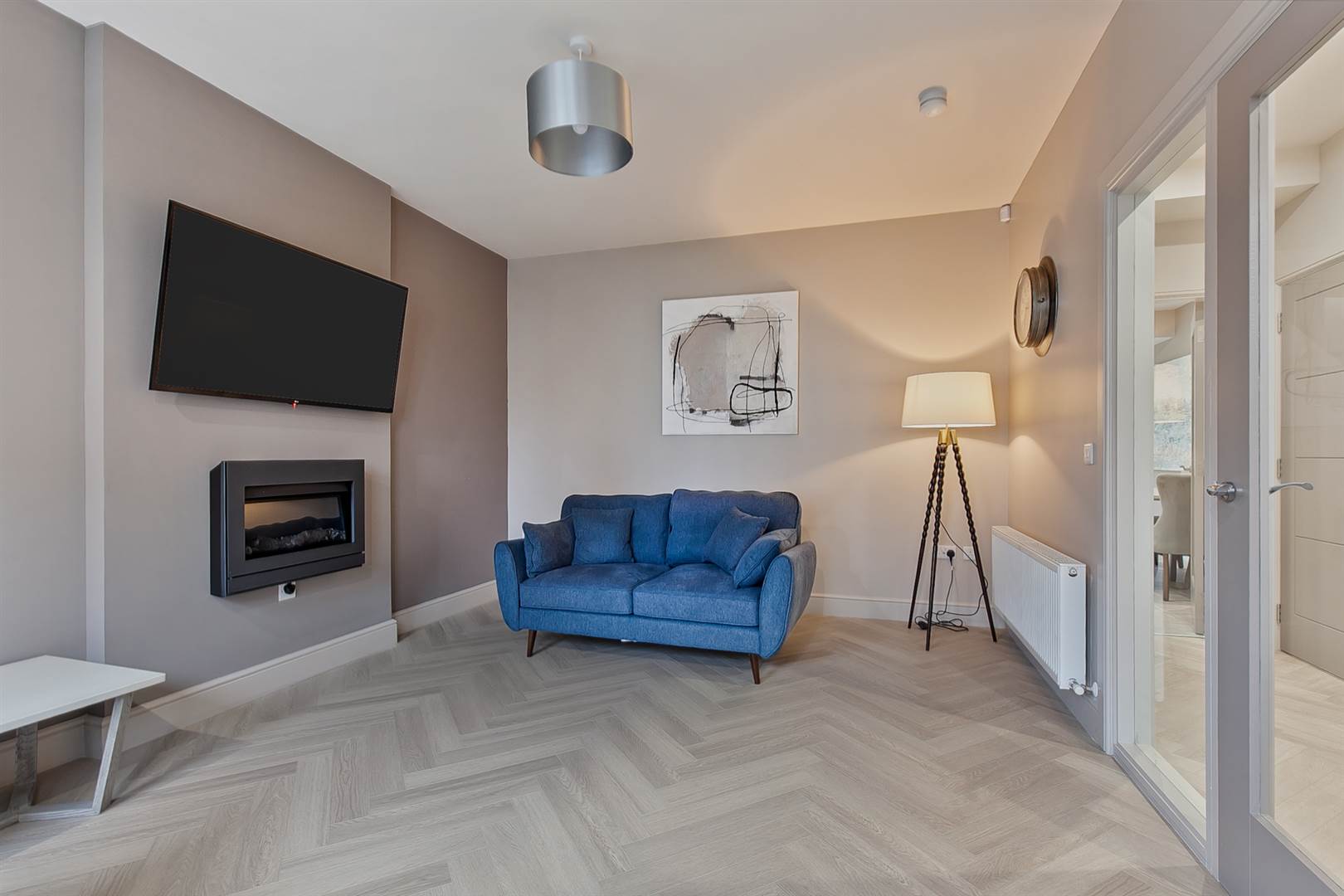 Feature wall-mounted electric fire, herringbone floor finished in a limed oak colour, glazed door and side light to entrance hall.