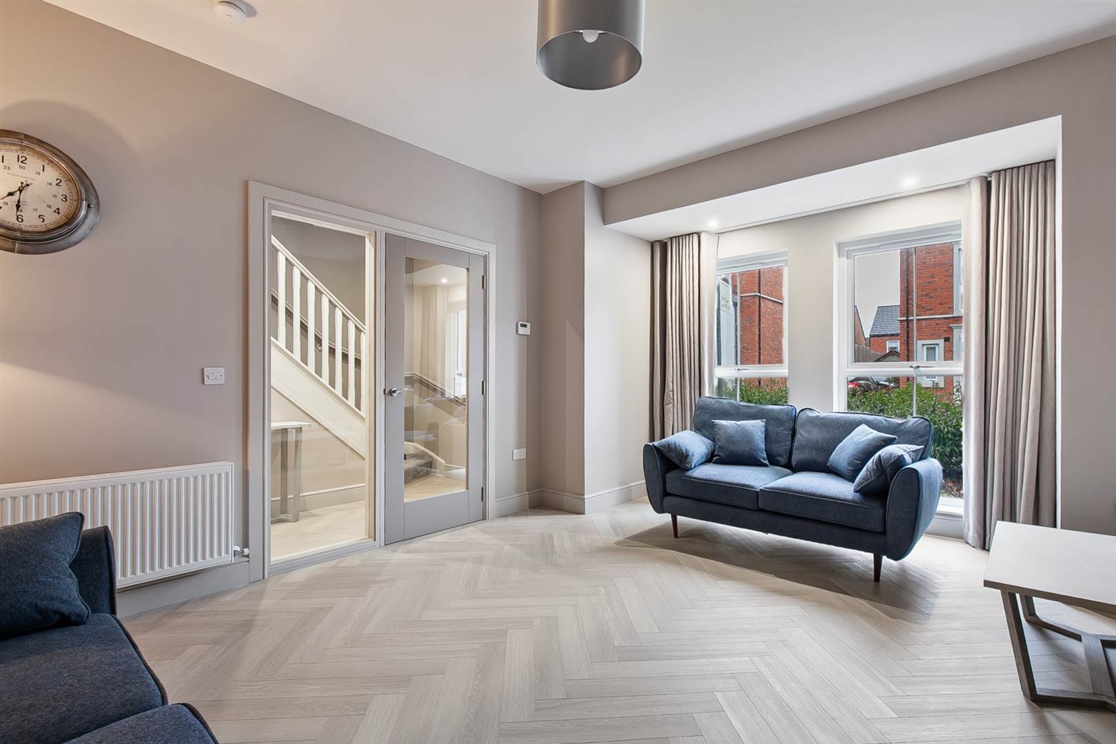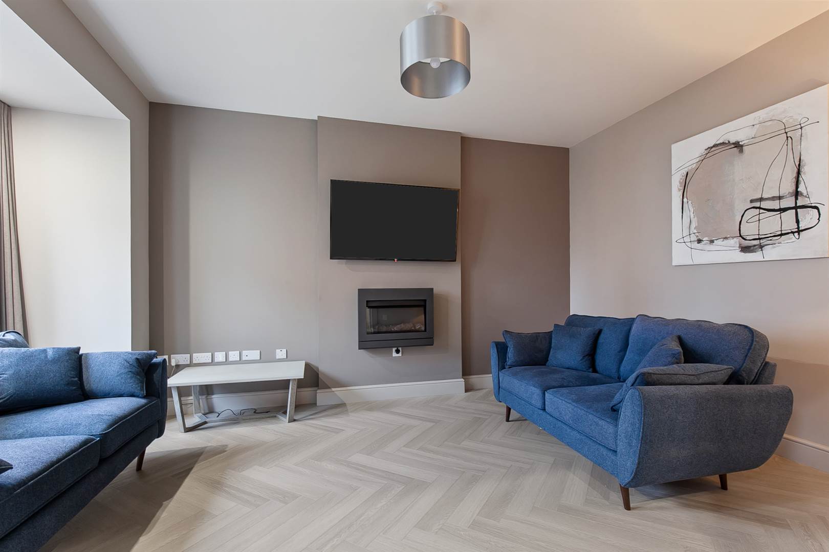 Drawing room with feature fire and herringbone limed oak laminate flooring