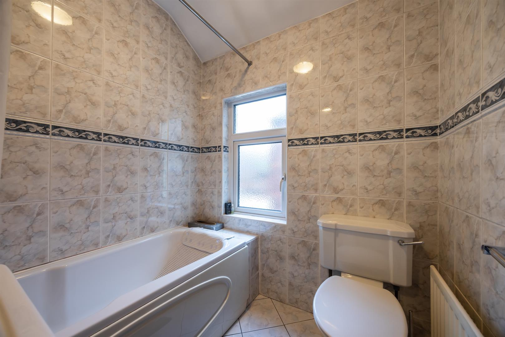 On the first floor, there are two bedrooms, both benefiting from built-in storage, along with a bathroom fitted with a white suite and overhead shower. Further storage is available within the floored roofspace, which also houses the gas fired boiler.