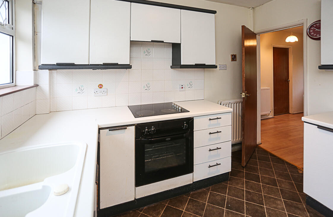 Excellent range of high and low level units, part tiled walls, laminate work surface, single drainer sink and a half ceramic sink unit, chrome mixer taps, plumbed for washing machine, integrated four ring hob, oven below, extractor hood above, outlook to rear gardens, space for fridge freezer, uPVC double glazed access door to side.