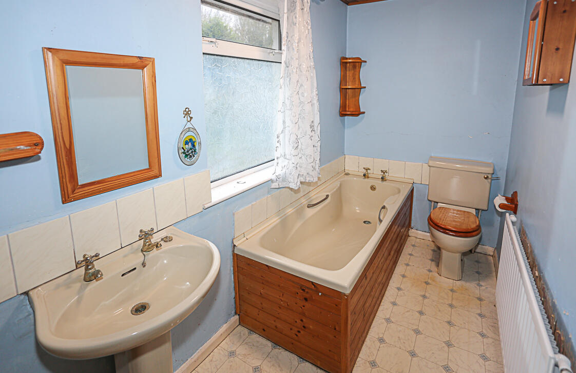 With light coloured suite comprising low flush WC, panelled bath, pedestal wash hand basin, built-in fully tiled shower cubicle with Mira electric shower unit, tongue and groove ceiling.