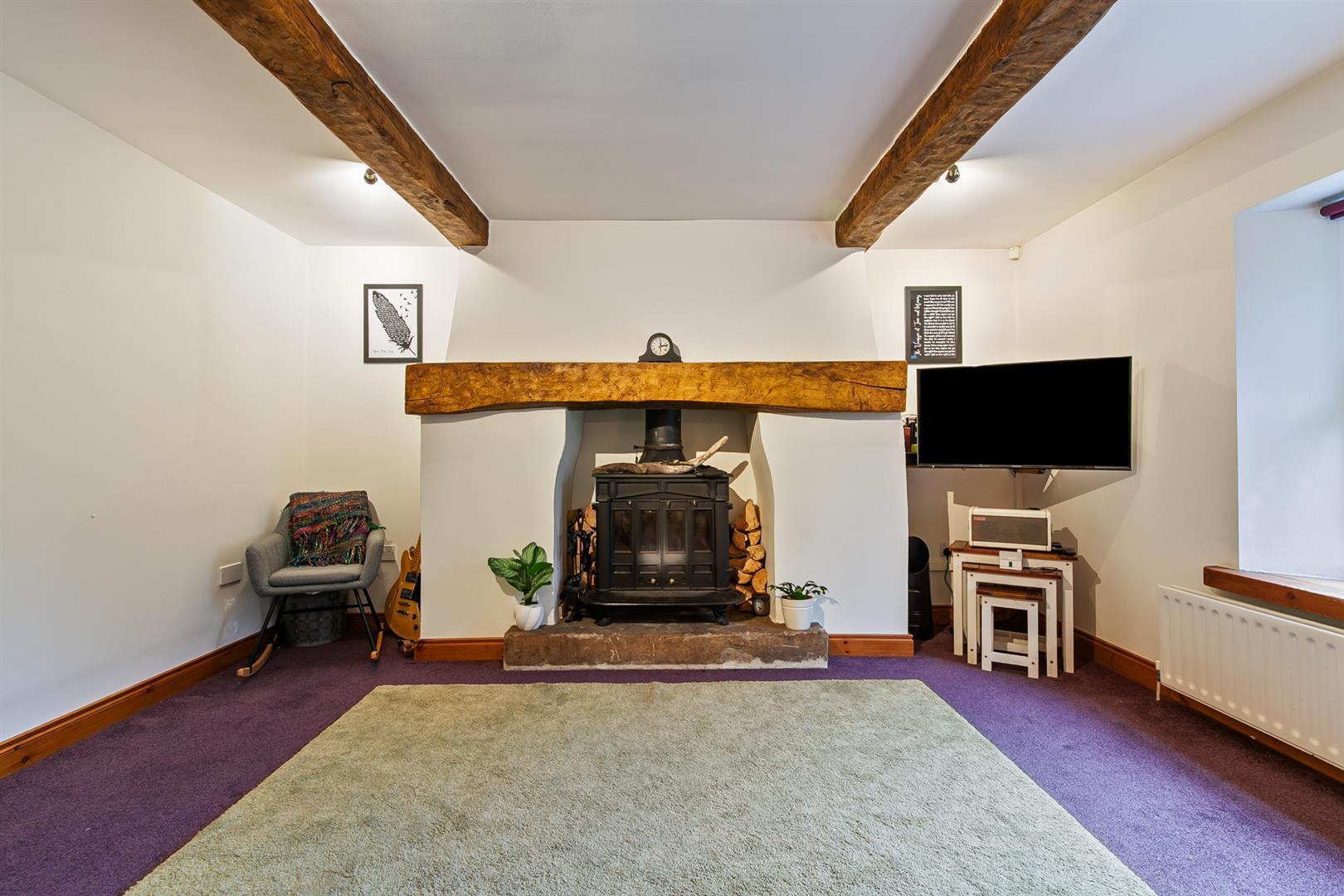 Inglenook recess with cast iron, wood burning stove on stone hearth.