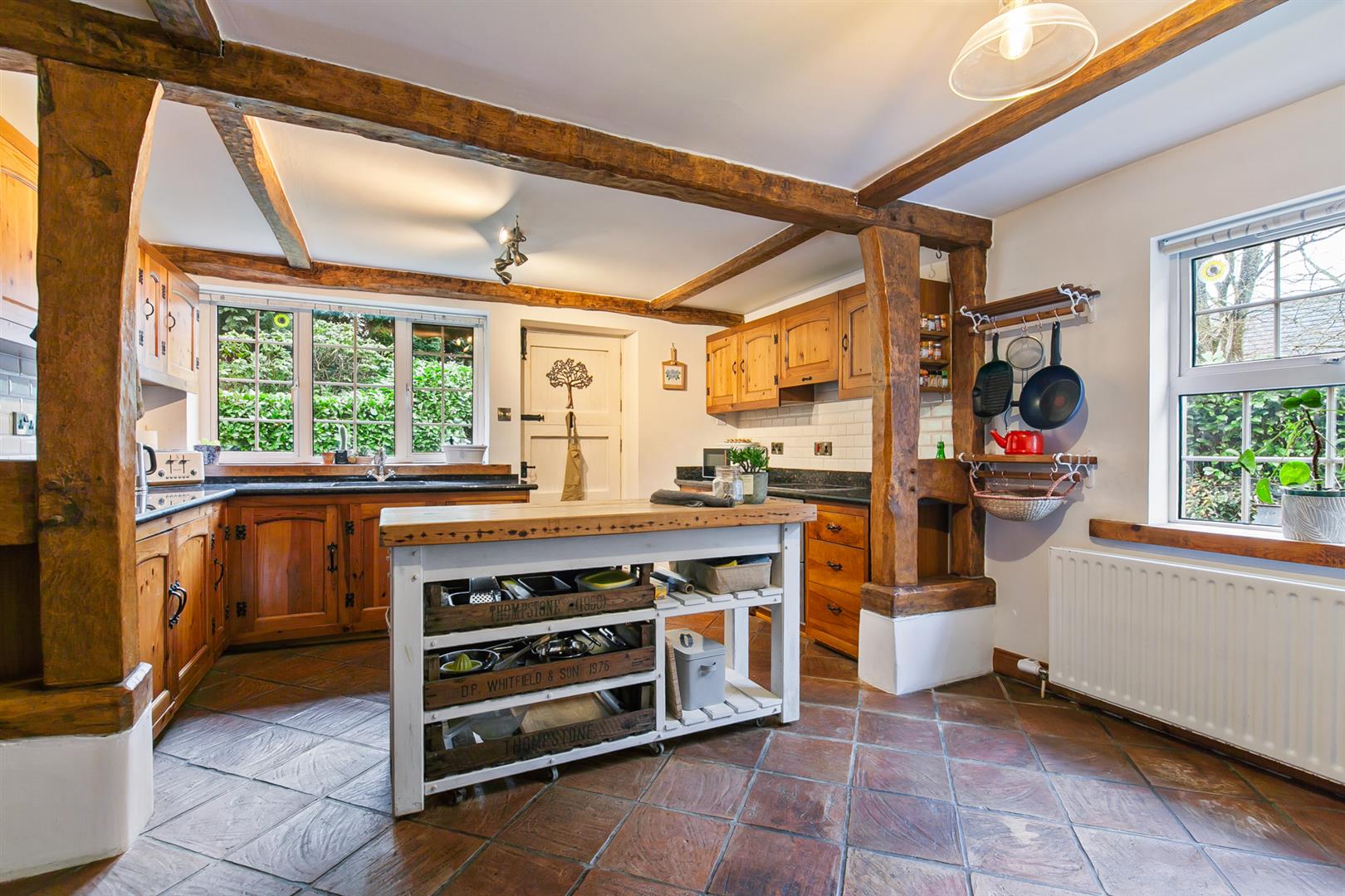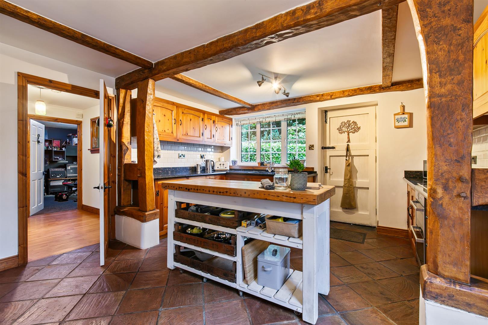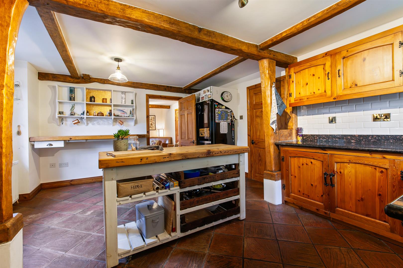 Country style, in-frame kitchen with range of high and low level storage units with contrasting, solid granite work surface. Ceramic, Belfast style sink unit. Integrated, touch screen, Bosch, ceramic hob with extractor hood over. Integrated, Bosch double oven. Integrated dishwasher. Space for American style fridge freezer. Fitted breakfast bar unit. Splashback tiling and solid granite upstands to walls. Tiled floor. Timber stable style door to rear garden.