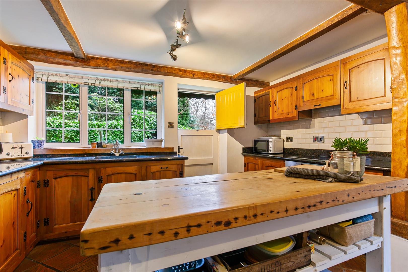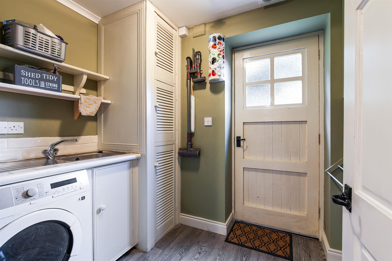 Range of fitted storage units and tiled work surface. Stainless steel sink unit with draining bay. Plumbed and space for washing machine. Splashback tiling to walls. Timber, glass panelled door to rear garden.