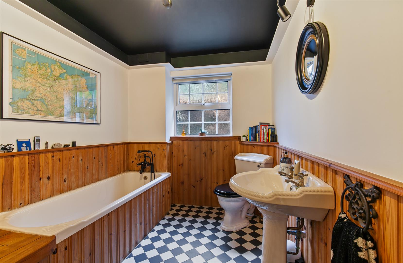 White, three piece suite comprising panelled bath, pedestal wash hand basin and WC. Timber panelling to walls. Tiled floor. Access to hot press.