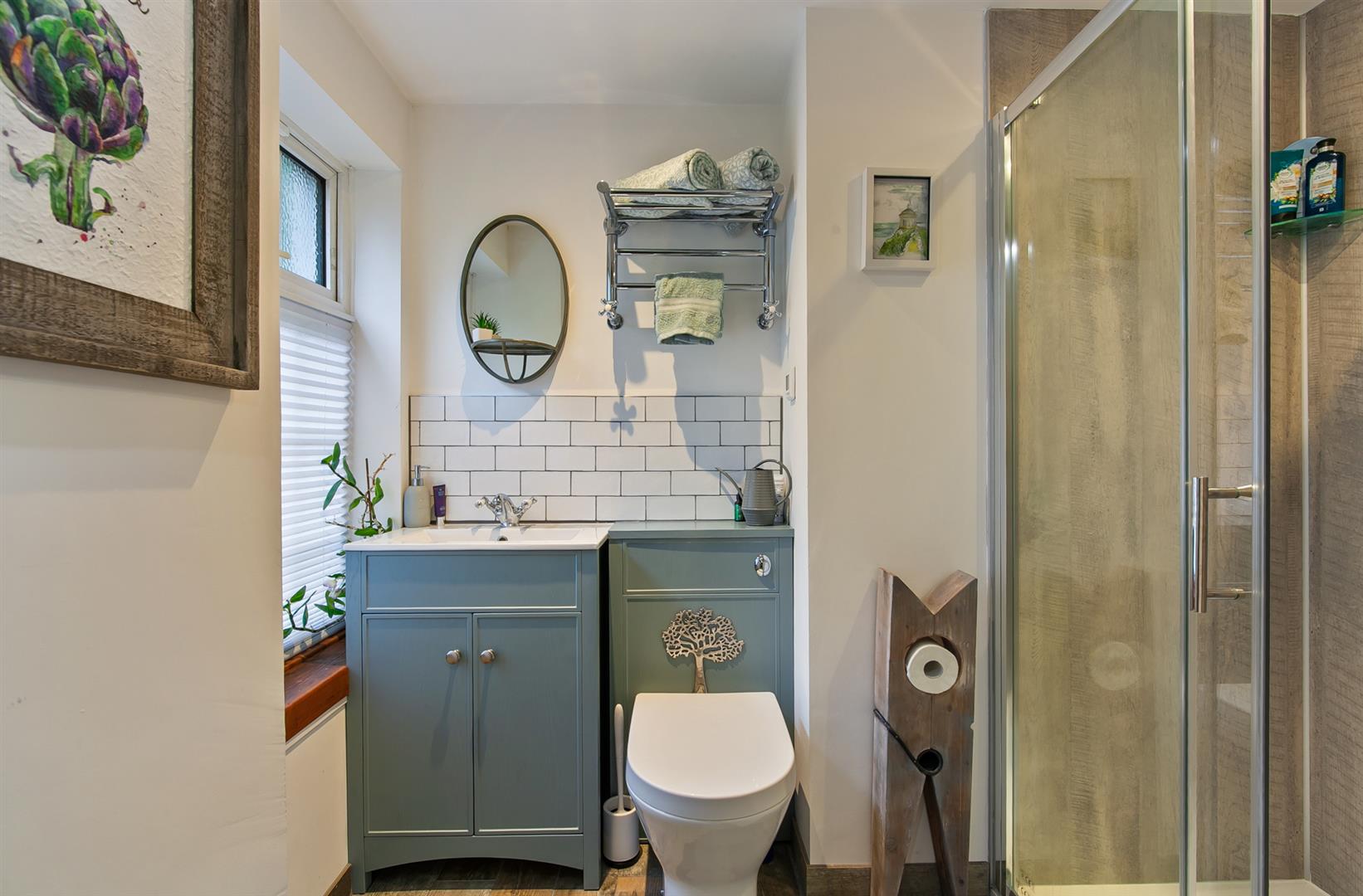 Contemporary, white, three piece suite comprising oversized shower enclosure, vanity unit and concealed cistern WC. Thermostat controlled mains shower unit with drench shower head. Splashback tiling to sink. Tiled floor. Underfloor heating.