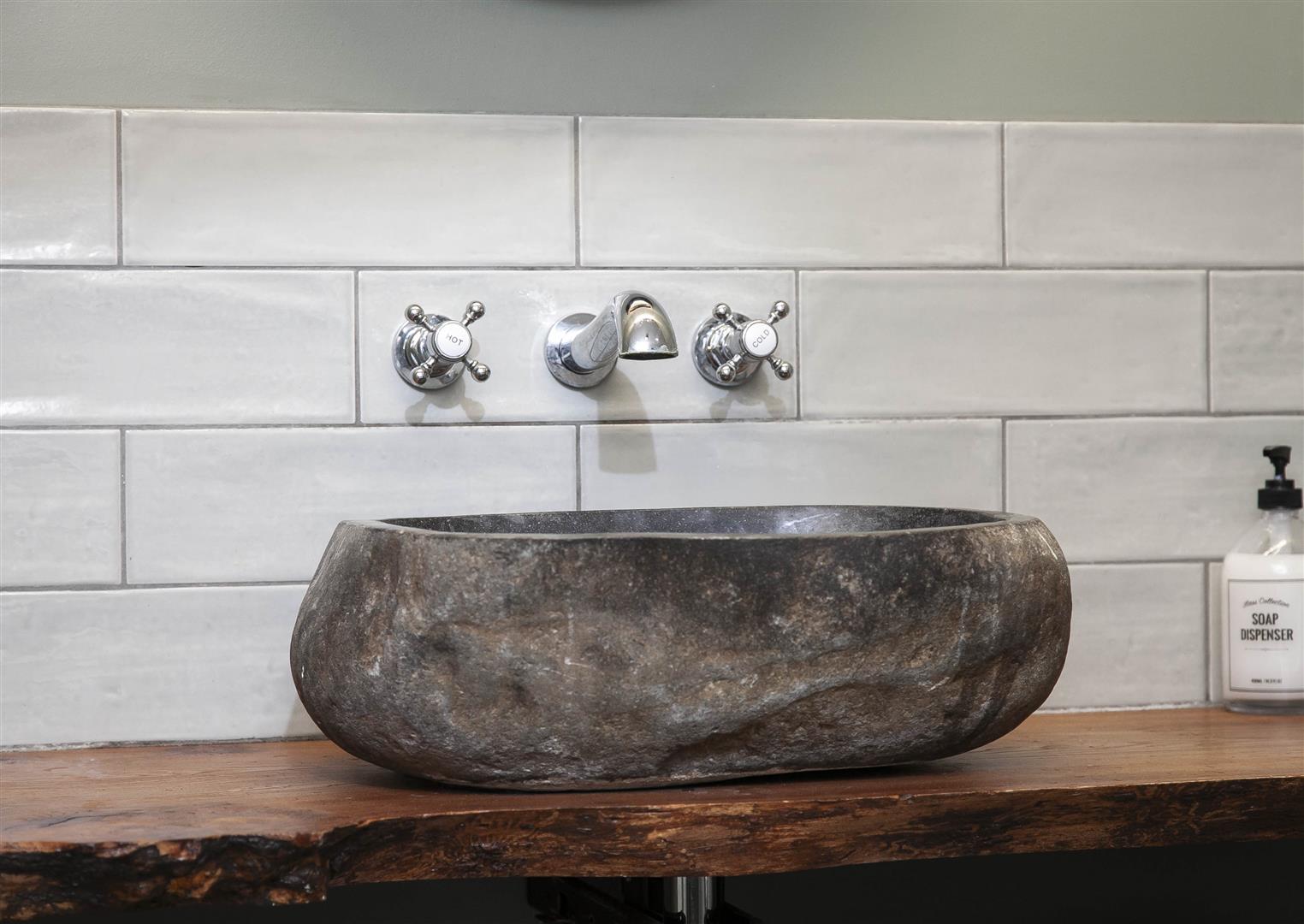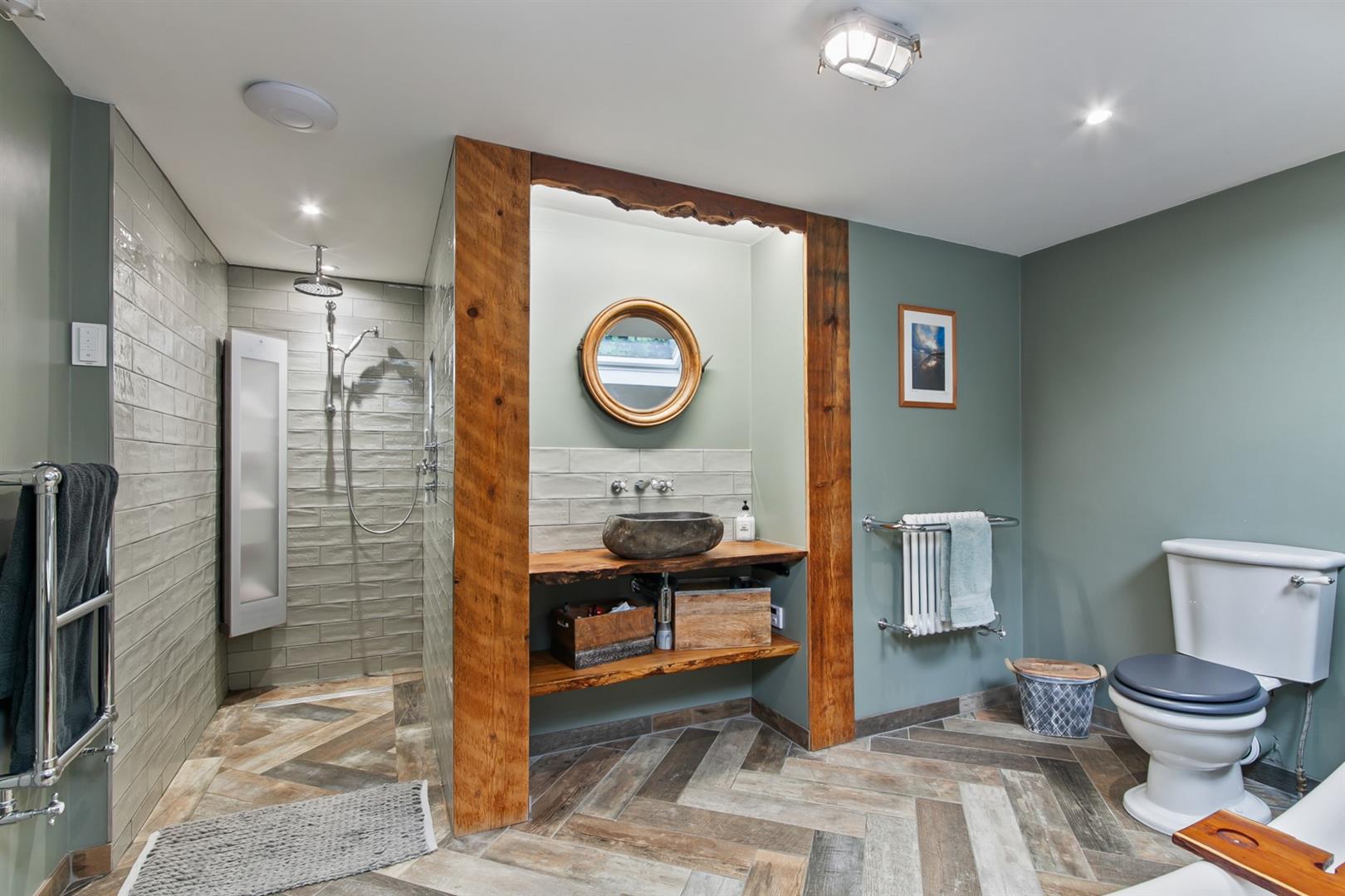 Contemporary, four piece suite comprising freestanding bath, fully tiled shower enclosure, vanity unit with stone sink basin and WC. Range of fitted storage units. Thermostat controlled, UV and infrared, 'Sunshower' shower unit with drench shower head. Chrome towel radiator. Splashback tiling to sink. Tiled floor. Underfloor heating.