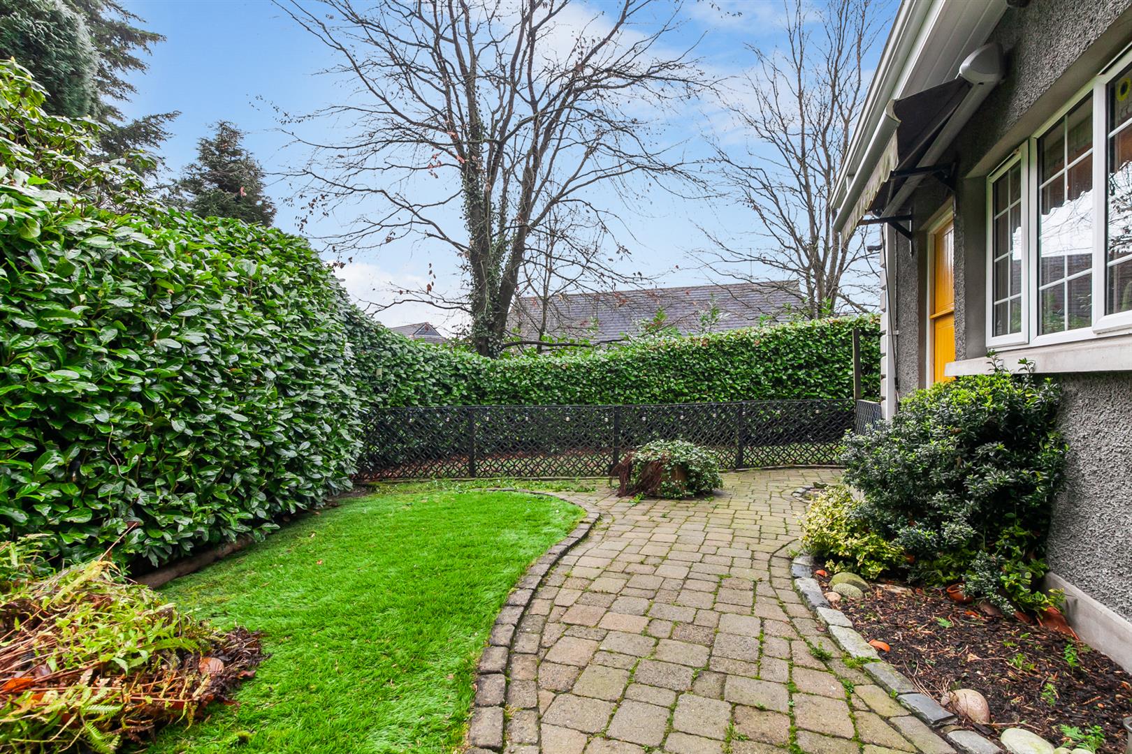 Fully enclosed rear garden finished in artificial grass, lawn, brick pavior patio area, pond, and range of shrubs.