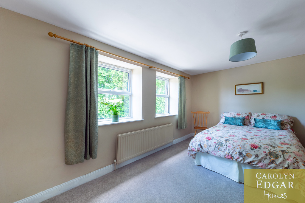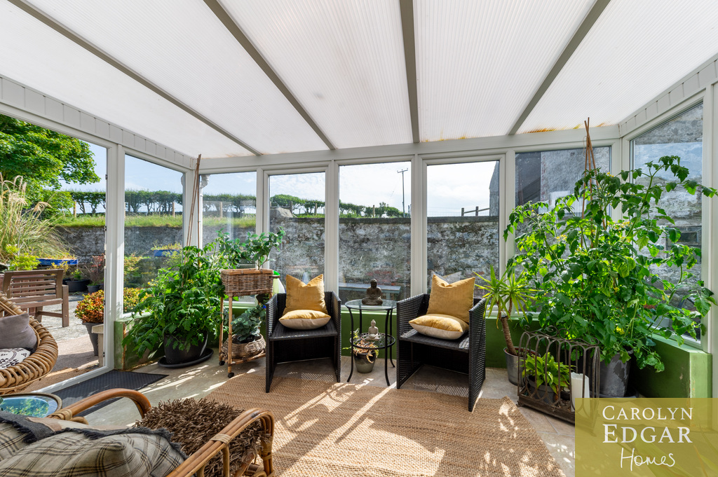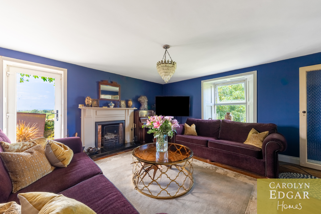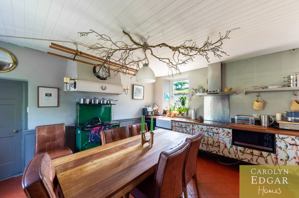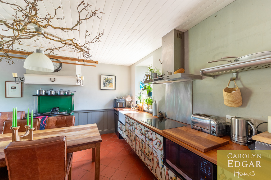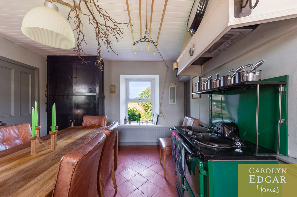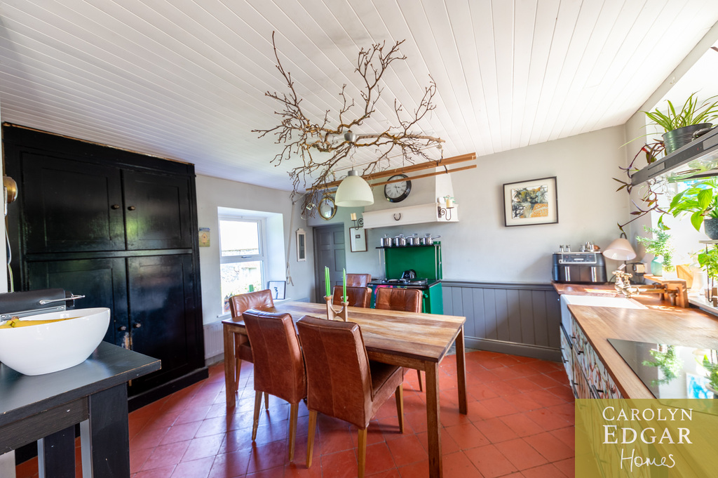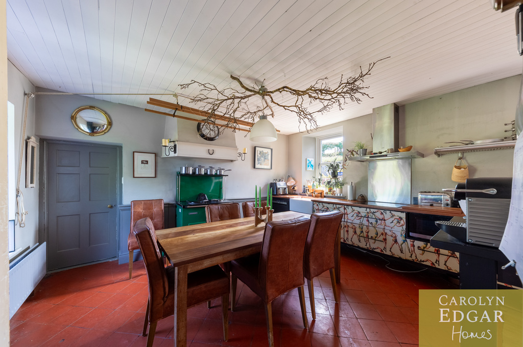 Internally, the property comprises of an inviting entrance hallway, spacious dual aspect drawing room with views of surrounding countryside, feature open fire place and access to sun terrace with firepit and raised barbeque area, all again with stunning views and sensational sunsets. The delightful and quirky kitchen is equipped with numerous built in appliances, an oil fired Esse Range adds warmth and functionality, bespoke hand made cupboards, floating units, Belfast sink, original terracotta tiles complete that extra character and charm. The sun room adjacent to the kitchen overlooks the rear gardens and also off the kitchen is a cosy family room providing a snug retreat. The ground floor also includes a family bathroom and two well appointed double bedrooms with a storage loft above. The first level features a third bedroom with breathtaking country views, a storage room that could be converted into a dressing room or bathroom, and a large office space.