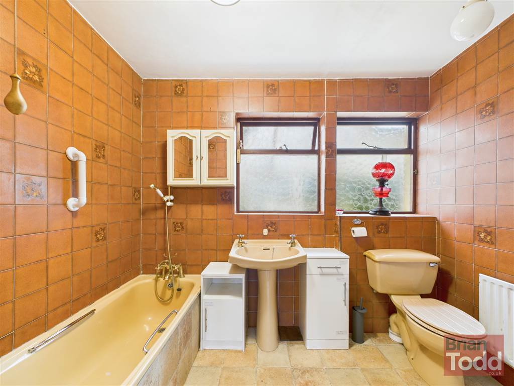 Colouired suite incorporating W.C., wash hand basin and panelled bath. Tiling.