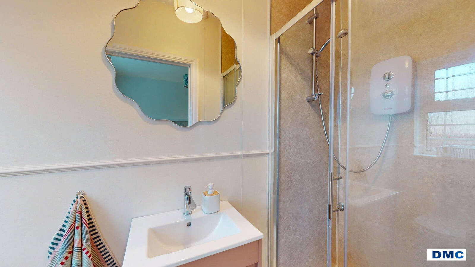 8'2 x 6'8 Deluxe white 4 piece suite comprising jacuzzi bath with mixer taps and shower attachment. Vanity unit with wash hand basin. Low flush w.c. Separate corner shower unit with overhead rain shower. Modern tiling to walls and floor. Vinyl ceiling covering. Wall mirror.