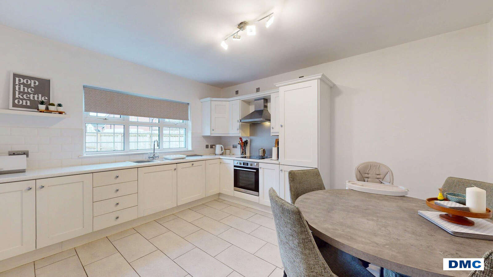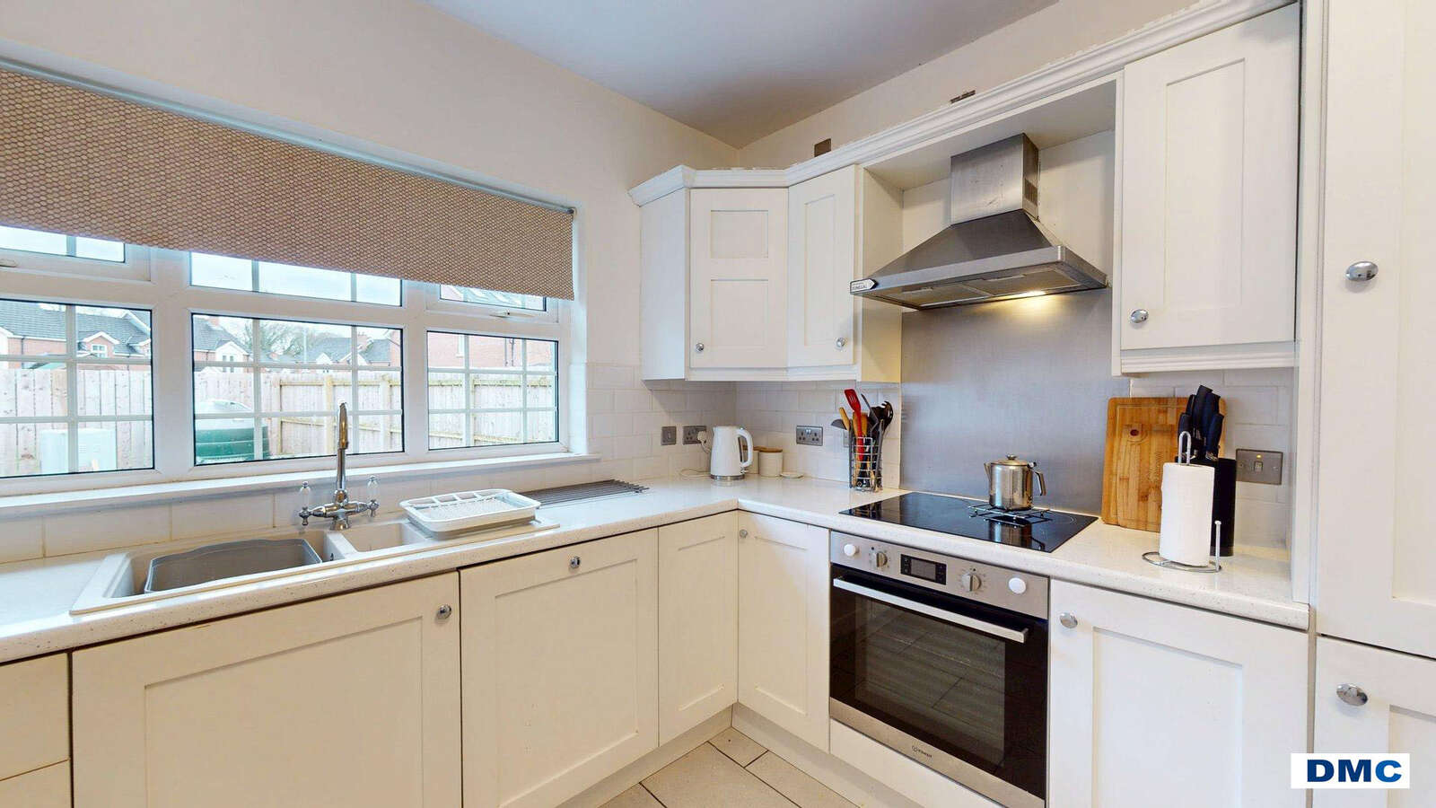 13'8 x 11'8 Excellent range of Contemporary Shaker style units with matching worktops. Ceramic one and a quarter bowl sink unit and drainer with chrome mixer taps. Modern tiling to walls and floors. BEKO integral dishwasher. Integral dishwasher. Integral fridge/freezer. INDESIT underoven and CANDY 4 ring Induction hob with stainless steel canopy housing concealed extractor fan.