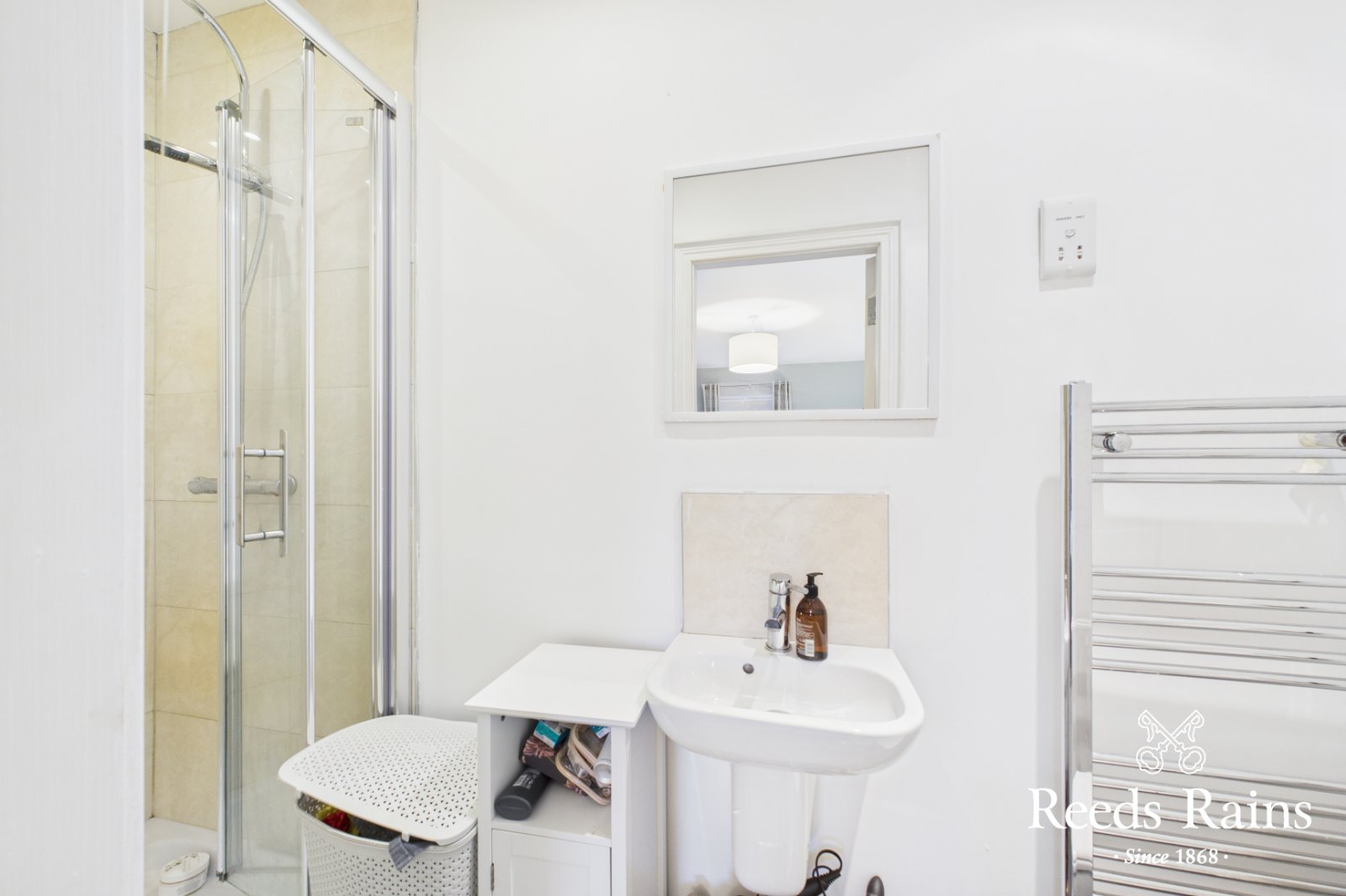 Separate shower cubicle with controlled shower, wash hand basin, low level WC