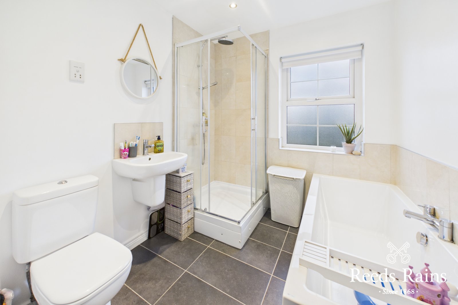 White suite comprising panelled bath, wash hand basin, low level WC, separate shower cubicle with controlled shower, wall and floor tiling.