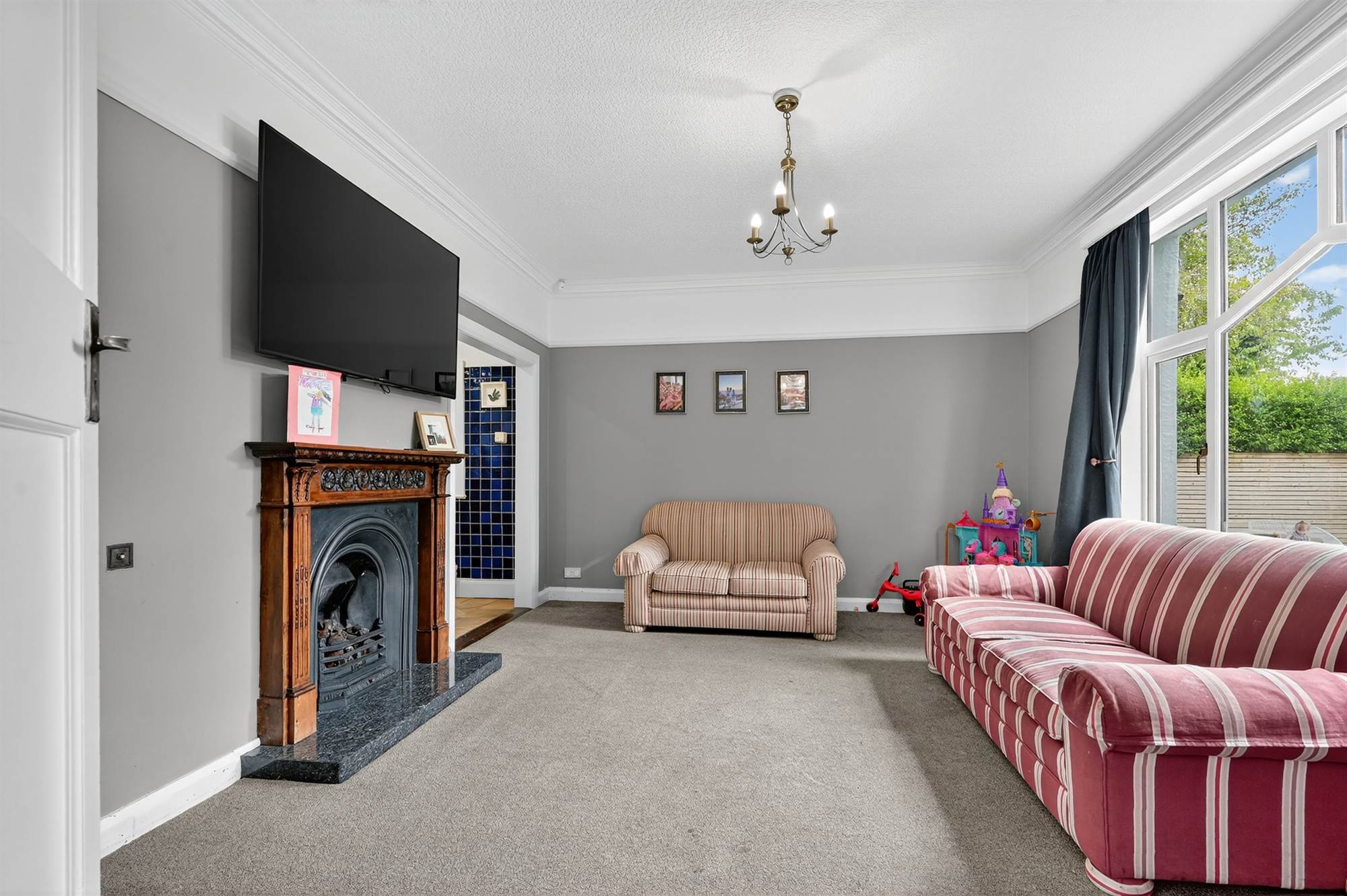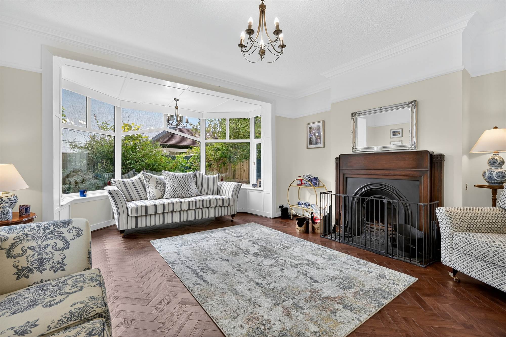 (into side bay). Oak fireplace with cast iron inset, cornice ceiling, parquet floor, side bay window, picture rail.