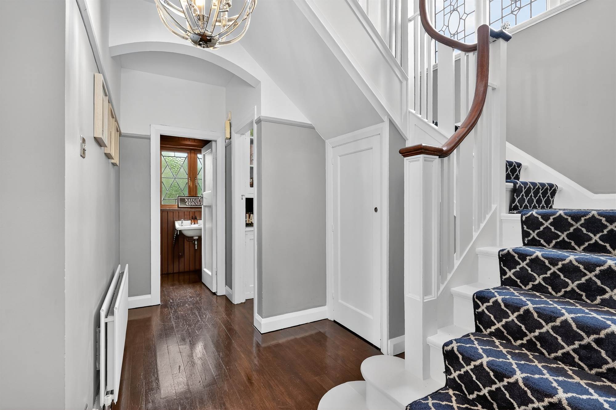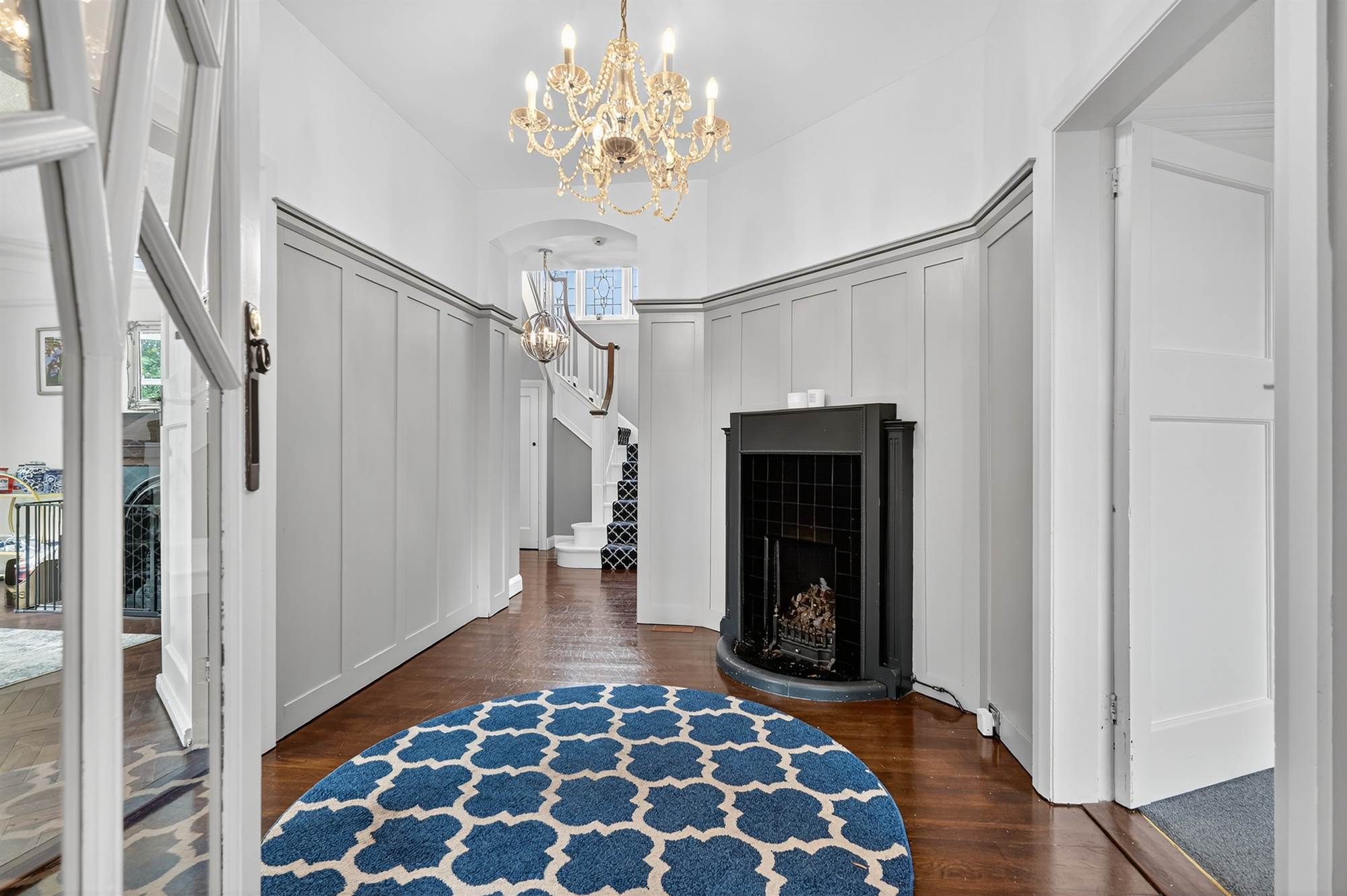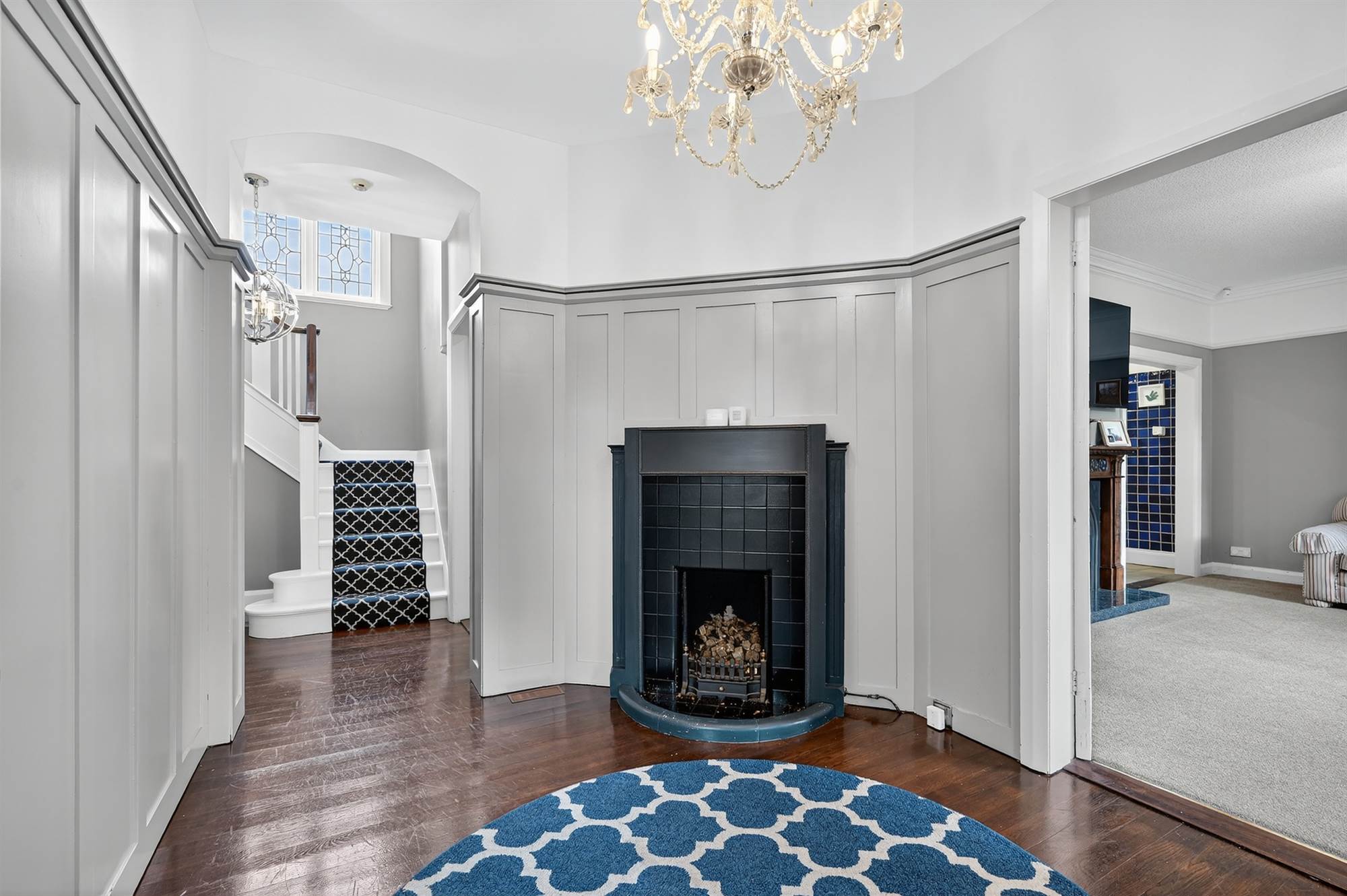 Entrance Porch and Spacious Entrance Hall with Attractive Fireplace and Gas Fire