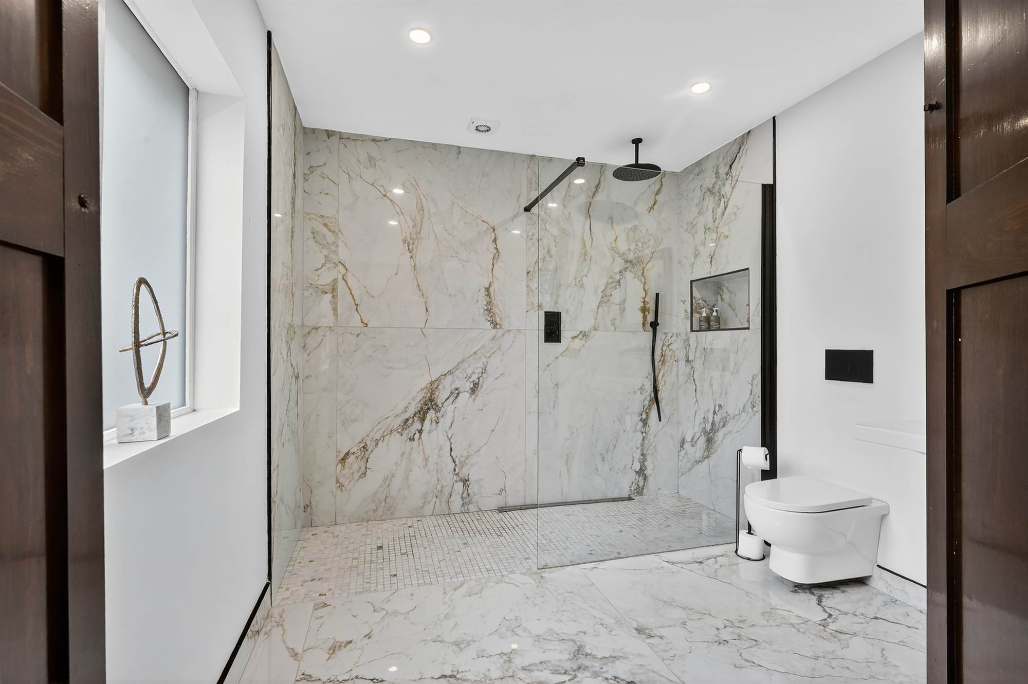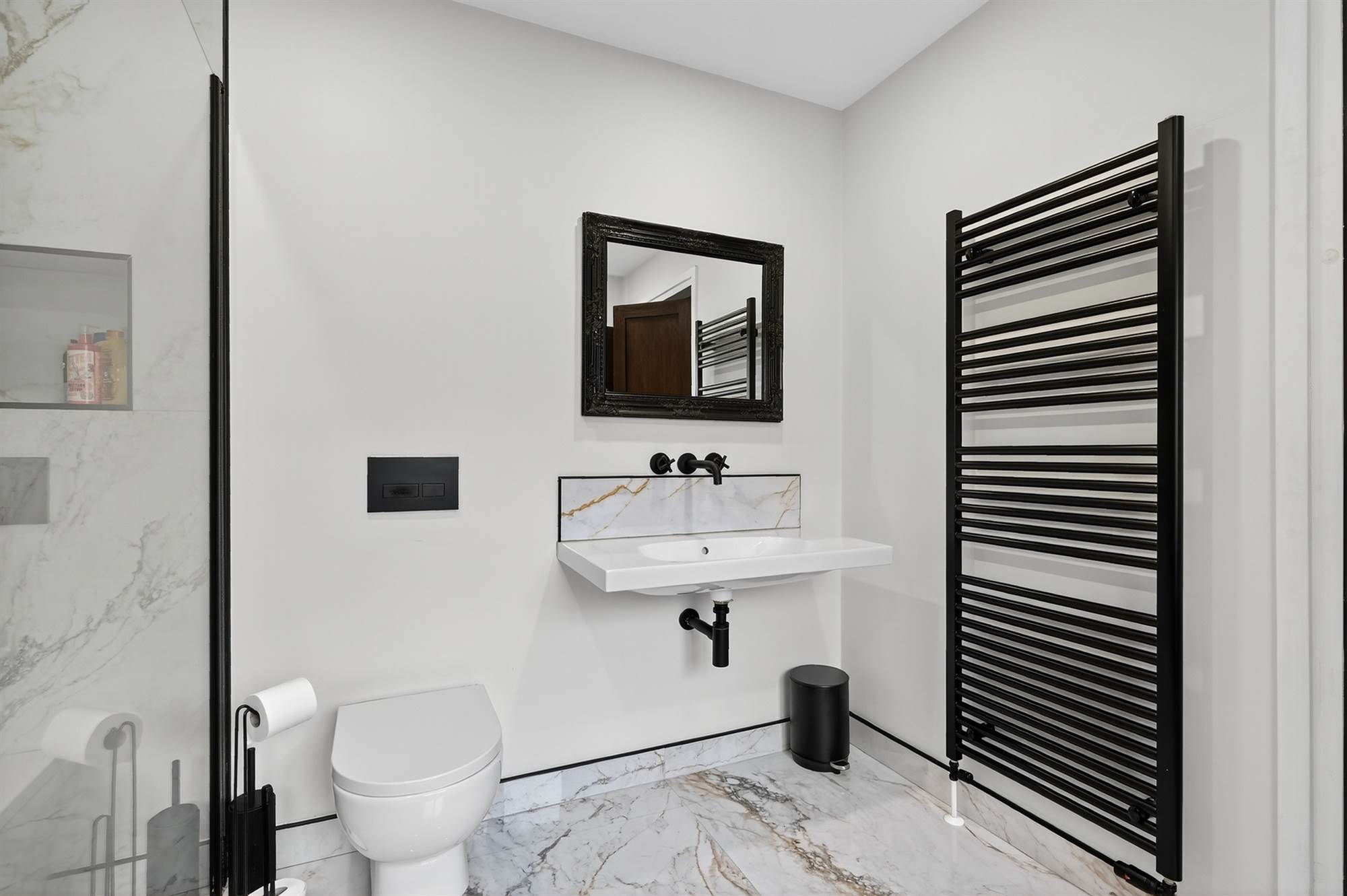 White suite comprising low flush wc, feature wash hand basin, fully tiled shower cubicle with drencher shower head, marble tiling, heated towel rail.