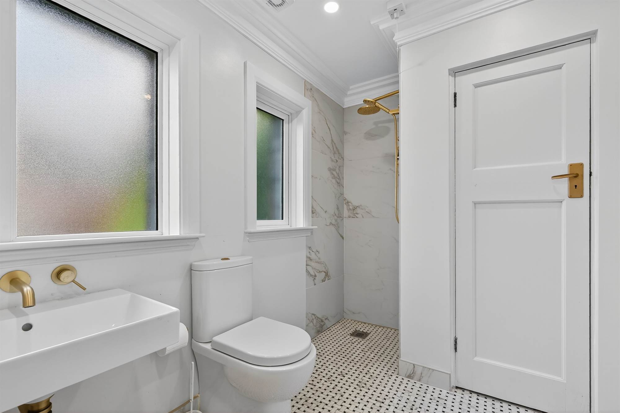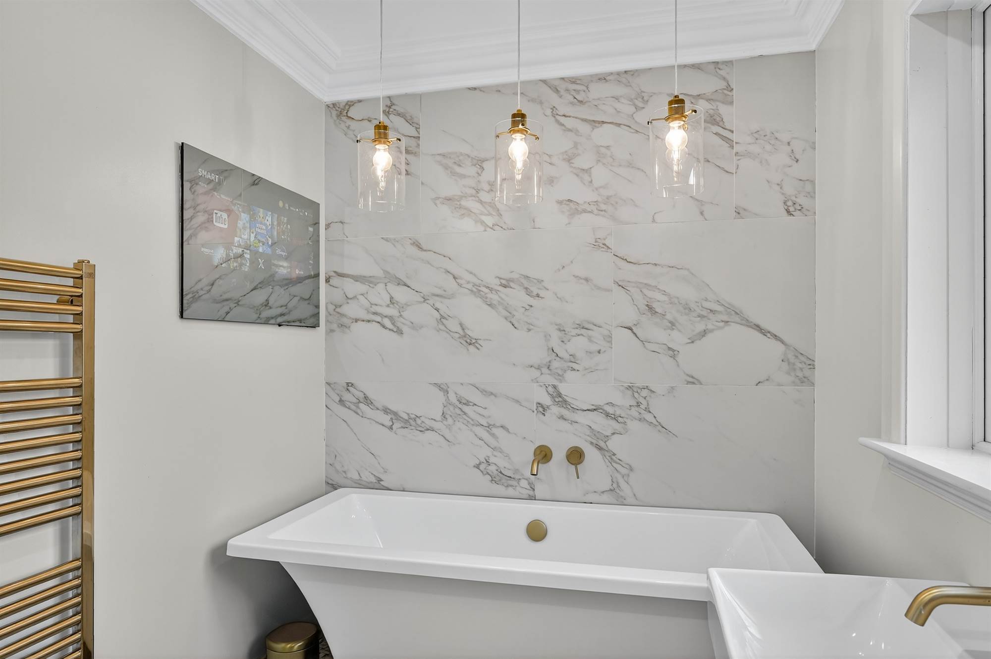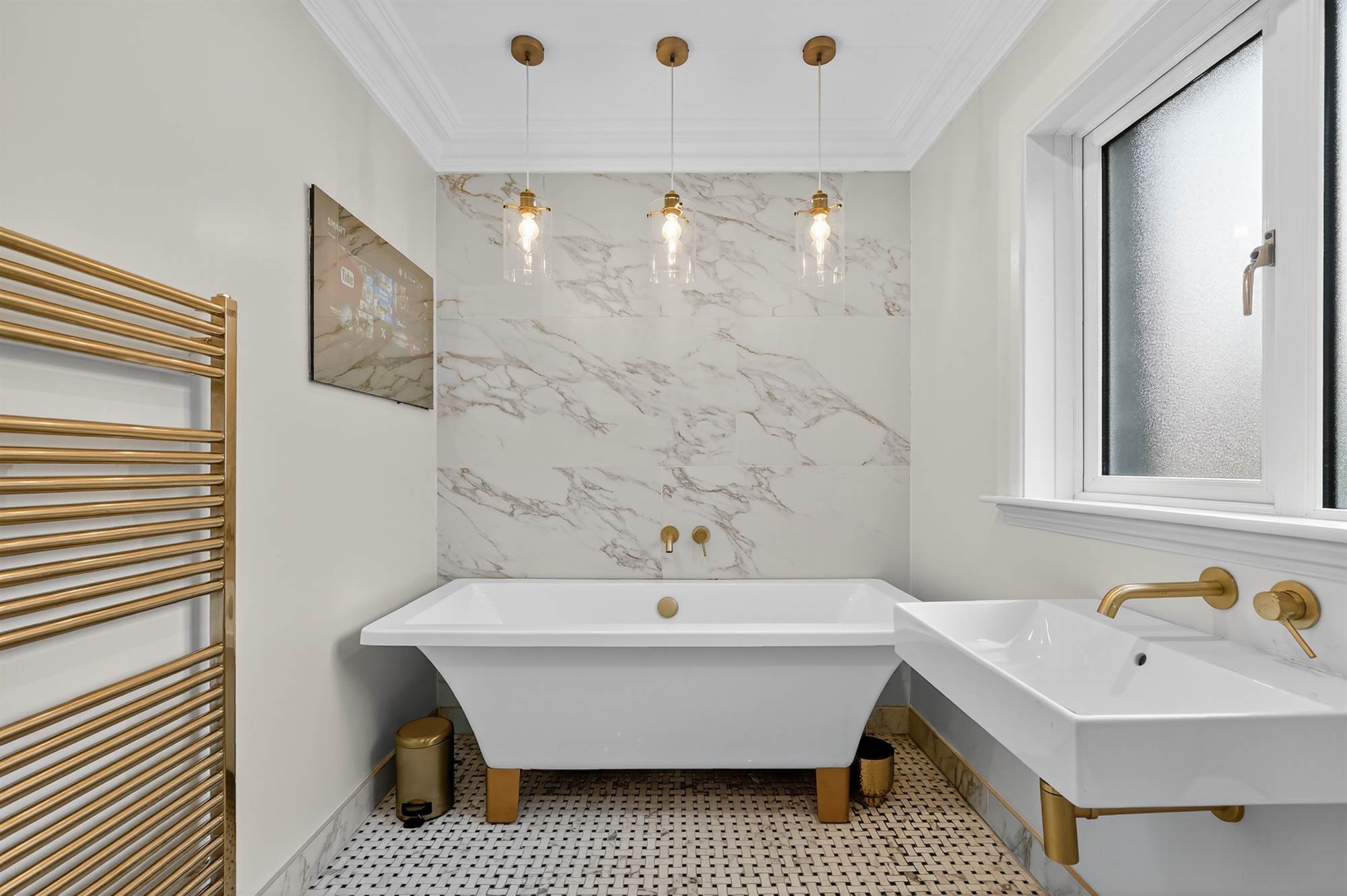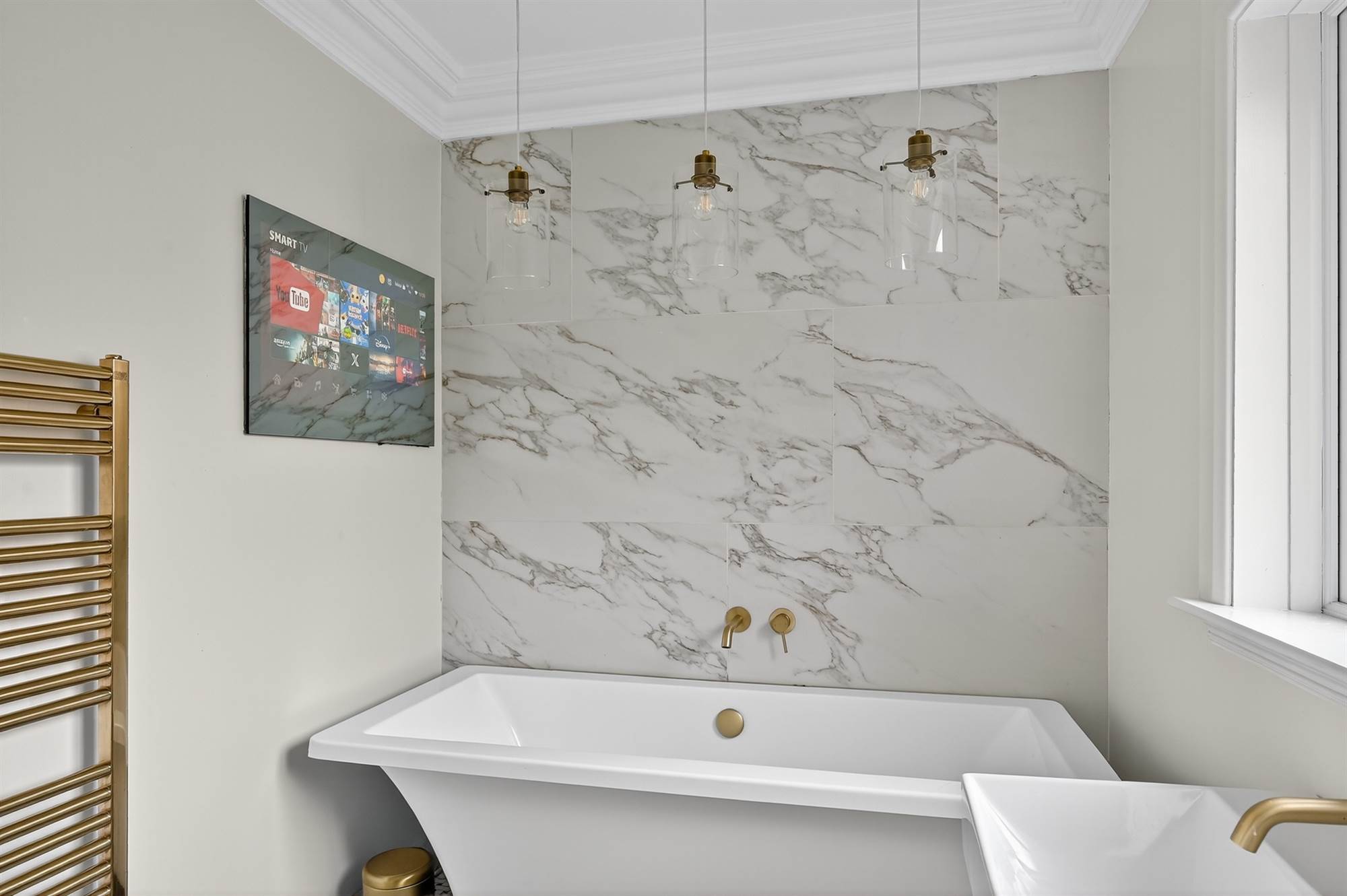White suite comprising free standing bath on brass feet with feature brass fittings, low flush wc, fully tiled shower cubicle with drencher shower head, hotpress with copper cylinder and immersion heater, heated towel rail, recessed spotlights, tiled floor, cornice ceiling.