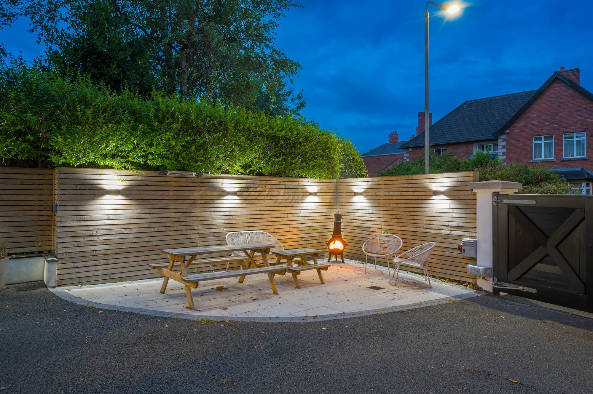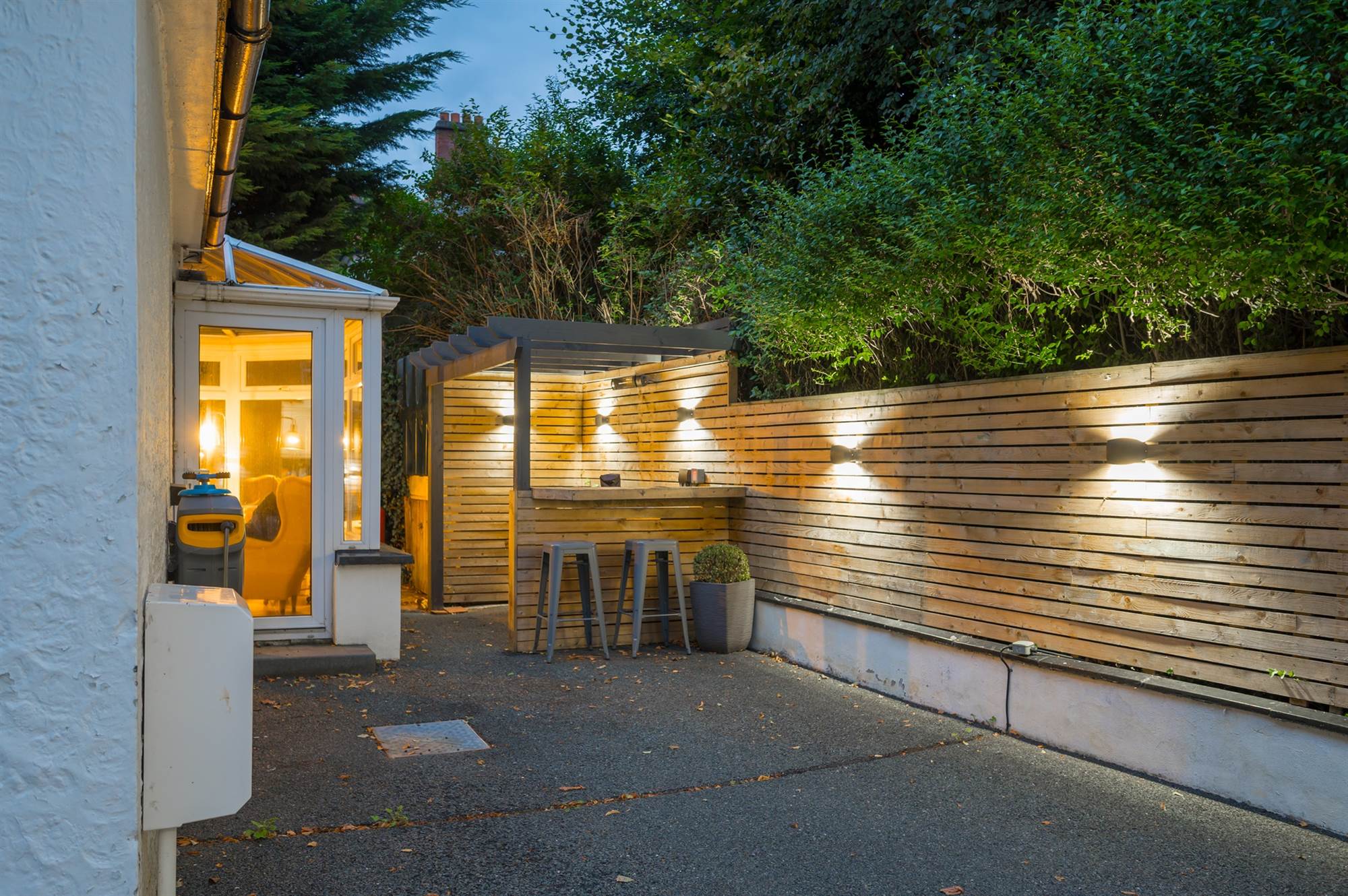 South Facing Front Gardens with Lawns and Mature Hedging and Trees, Delightful Paved Sun Terrace and BBQ Area with Outside Lighting, Power Points and Patio Heater