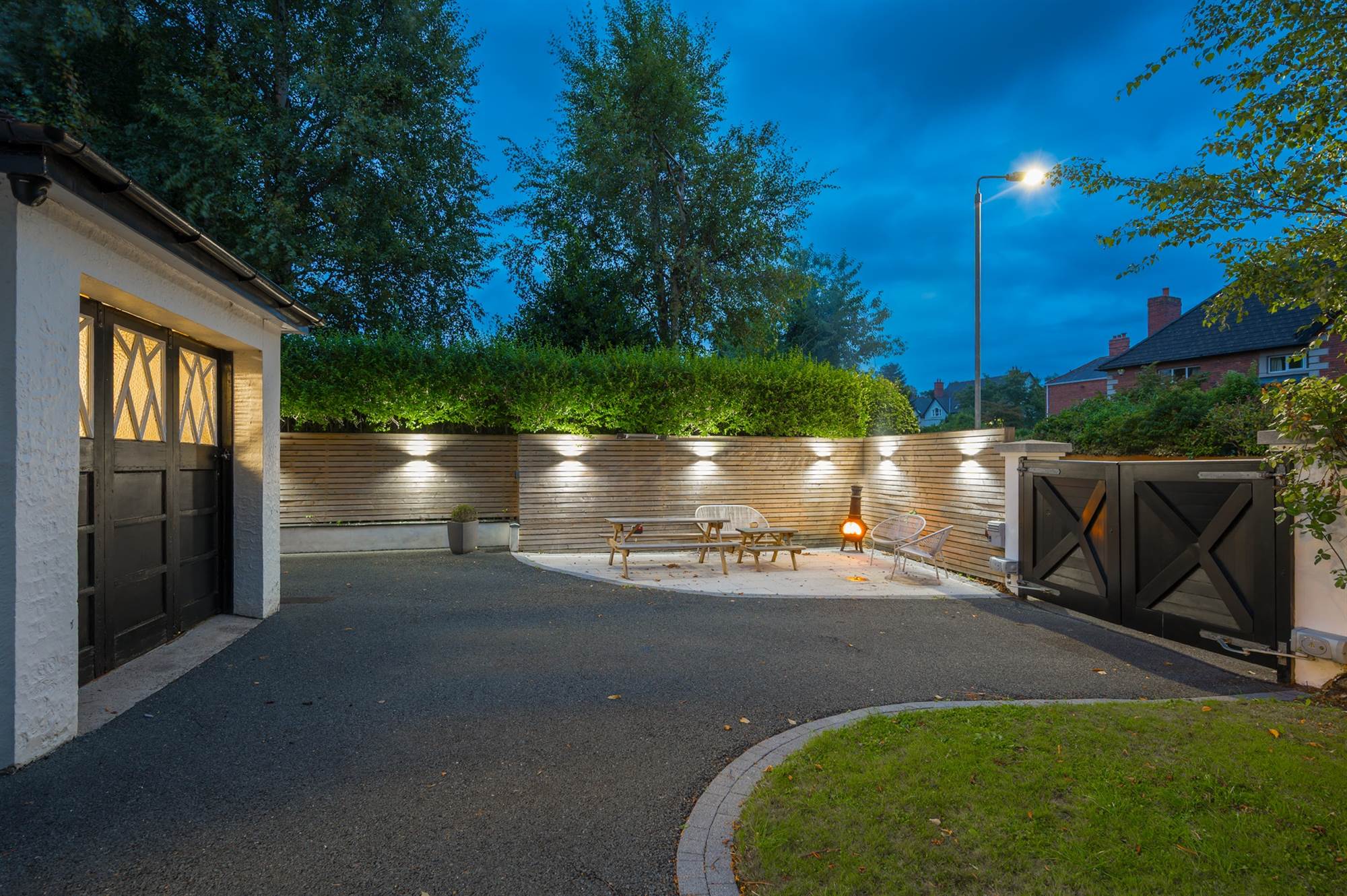 Double electric entrance gates, tarmac paved driveway with parking. South facing front gardens in lawns and beds, side patio area. Landscaped side terraces with outside lighting, integral garden store. Front, south facing patio with outside lighting, covered timber barbecue area with lighting and power points.