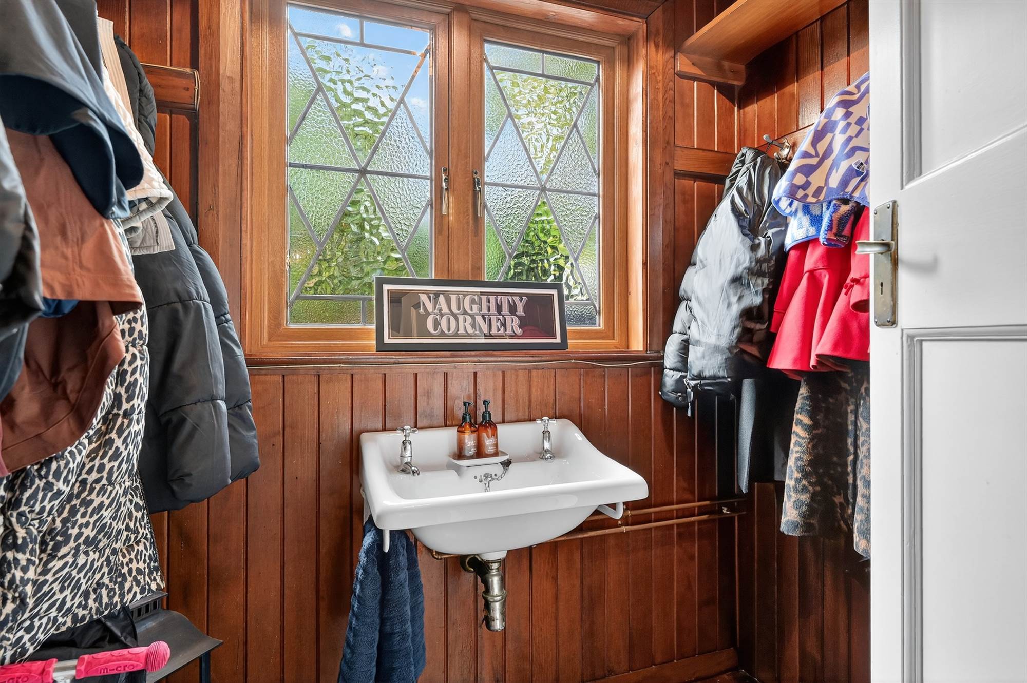 Wash hand basin, tongue and groove panelled walls. Separate low flush wc.