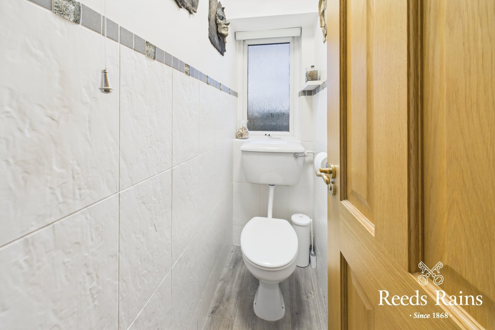 Separate WC and bath suite with tiled walls and pedestal white wash hand basin.