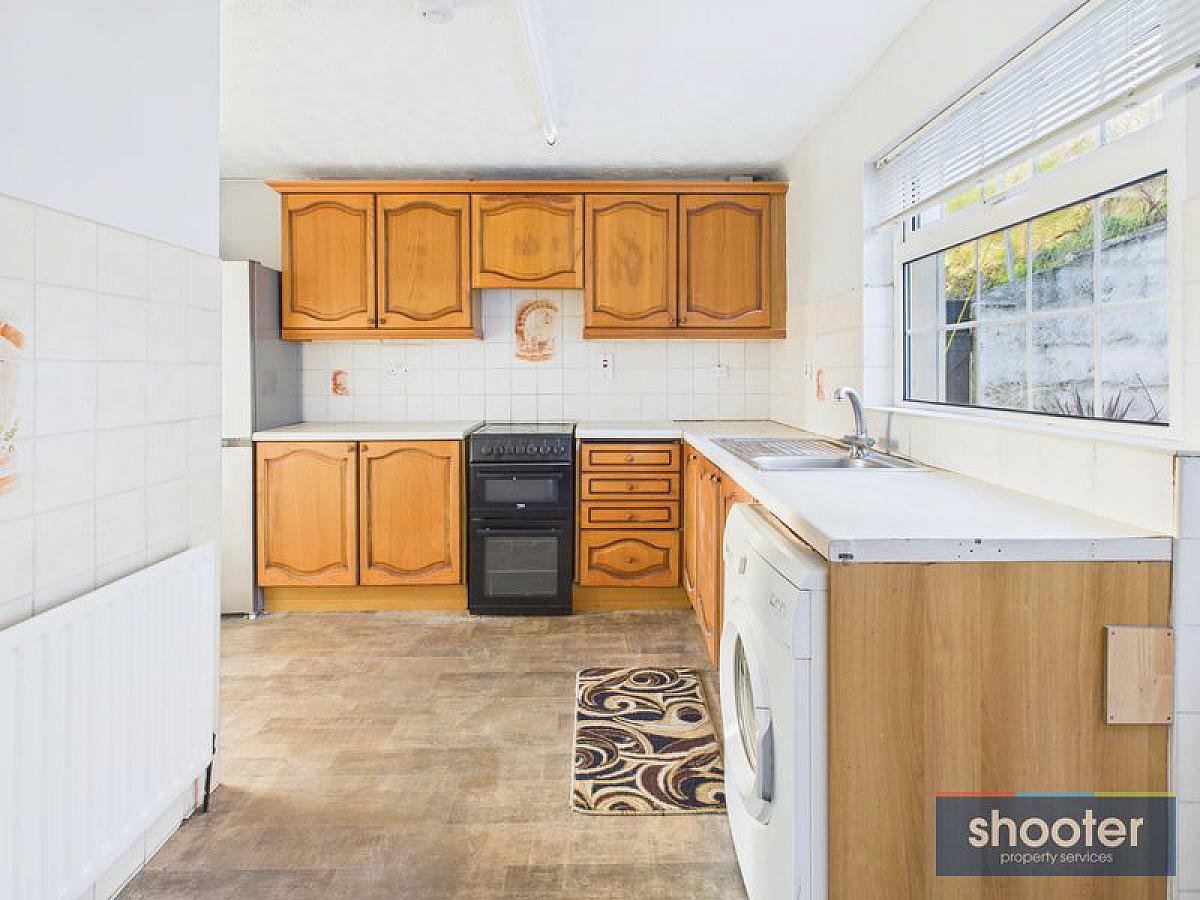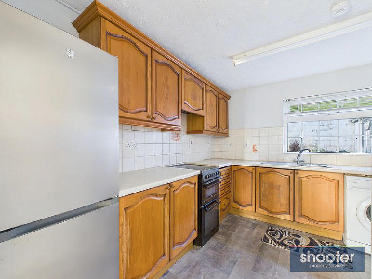 Range of high and low level units including cooker, fridge freezer and washing machine. Part tiled walls and extractor fan. Door to rear yard.