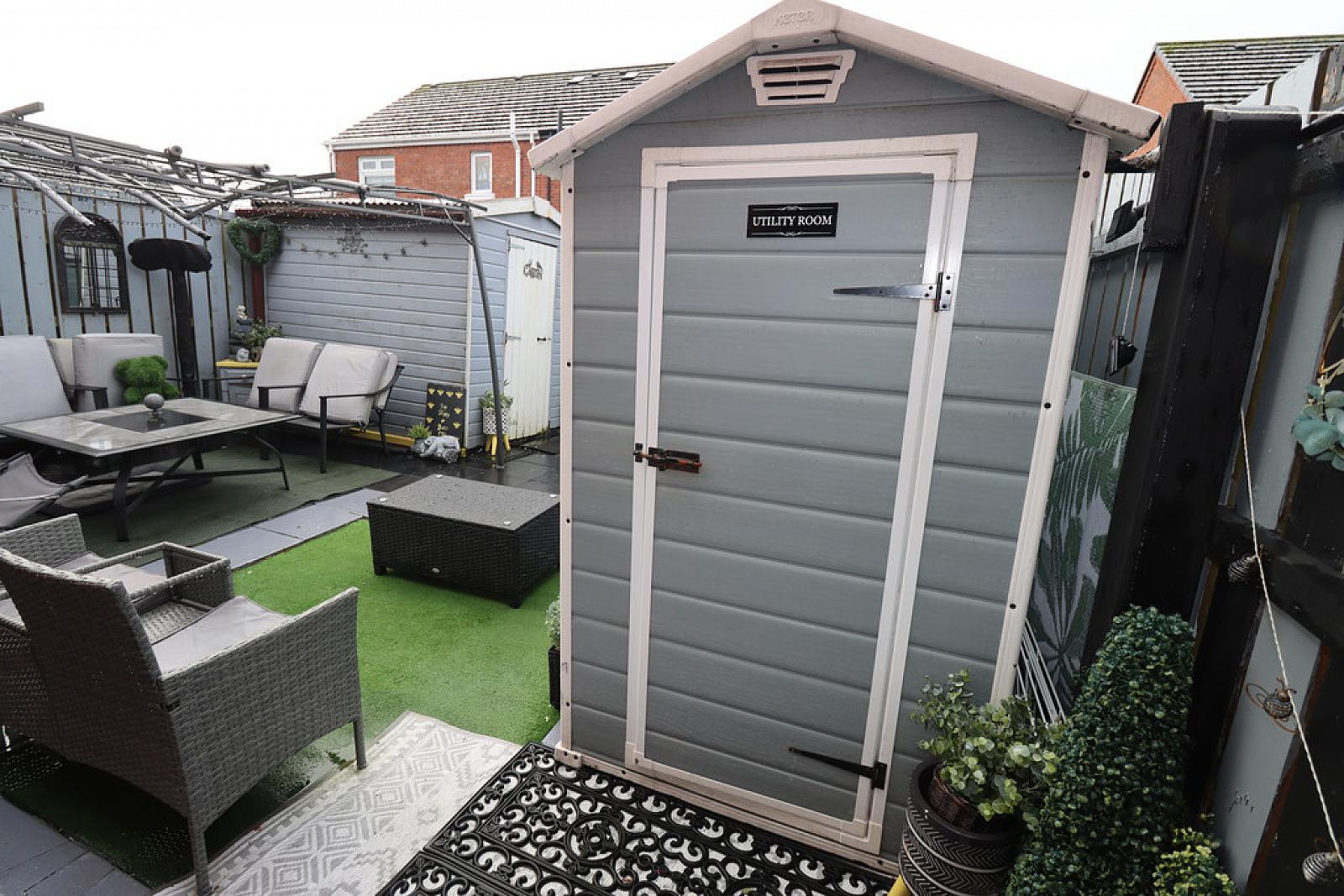 Rear: Enclosed to rear, neat paved patio, in stones, external shed wired for tumble dryer and plumbed for washing machine, separate shed with power, external double socket
